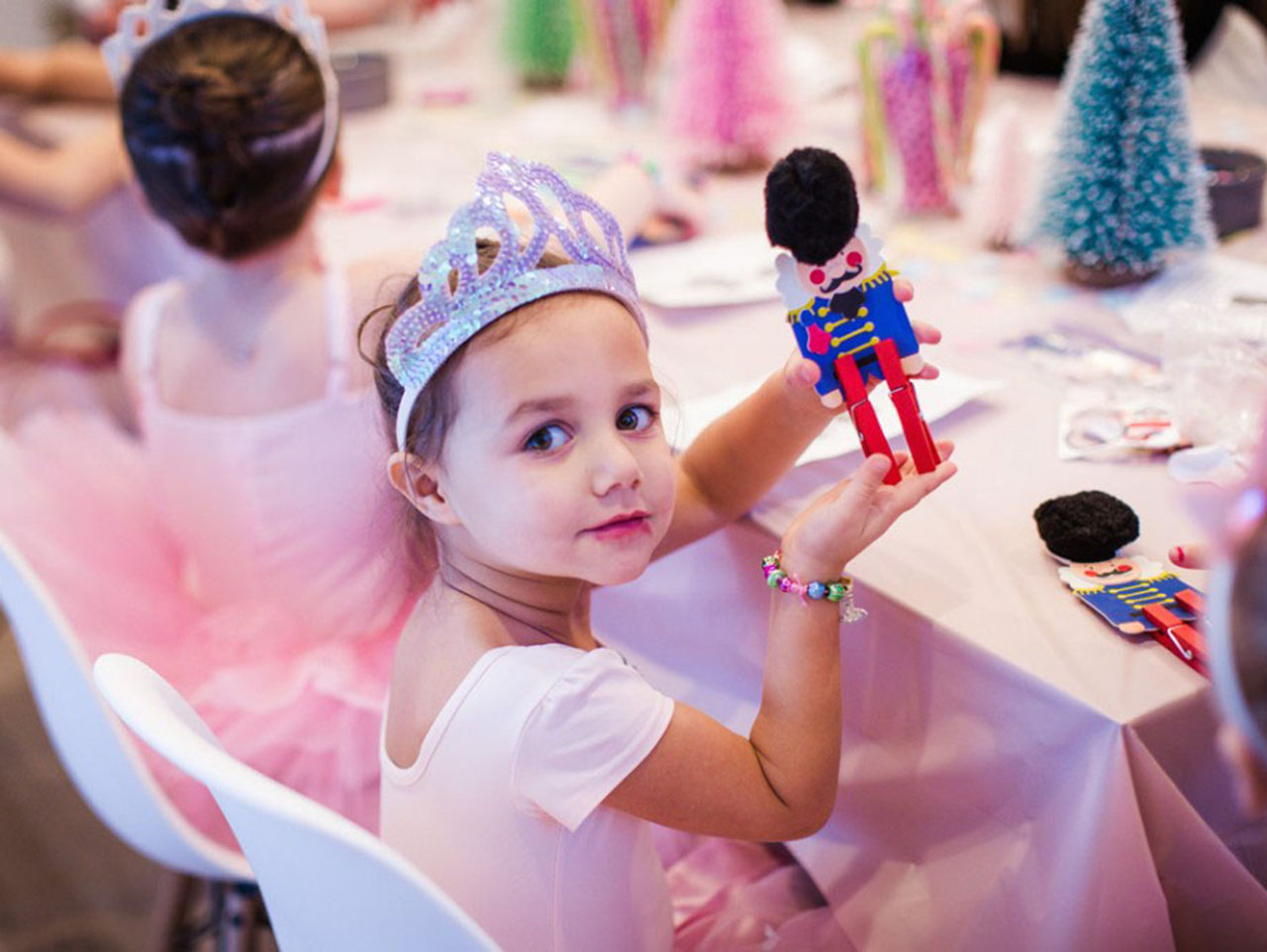 Next on the agenda was a nutcracker of their very own to take home. It was a must! These Nutcracker Clothespin Crafts were so fun, easy, and perfect for their age– a mix of 2-6-year-old little girls. They were pretty much peel and stick. Each little girl was so proud of their handy work!