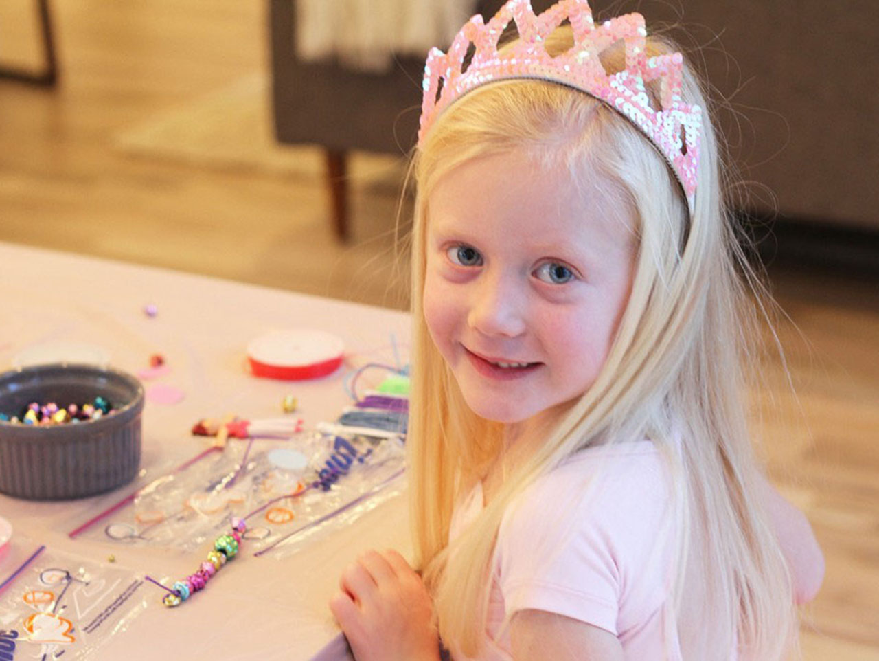First up: a ballerina charm bracelet. What little girl doesn’t want one of those? The girls got so excited about the Ballerina Charms and the little Ballerina Dress Charms. I tied a knot on the end of the stretchy cording and let them create their masterpieces. I was fascinated how careful they each selected their beads, and the order in which they went on. When they were done stringing, us moms tied them together and voila! Instant ballerina bling!