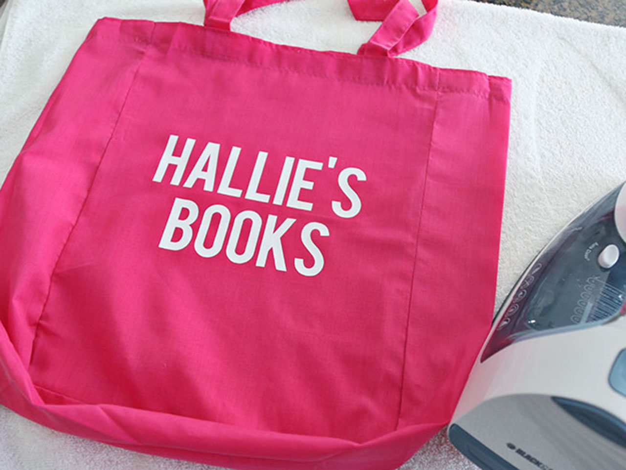 I took a tote and ironed on “iron on” vinyl lettering. These iron on letters are sold at most craft stores, or you can use a cutting machine like a Cricut. I love the contrast of white, bold letters on the bright bags.