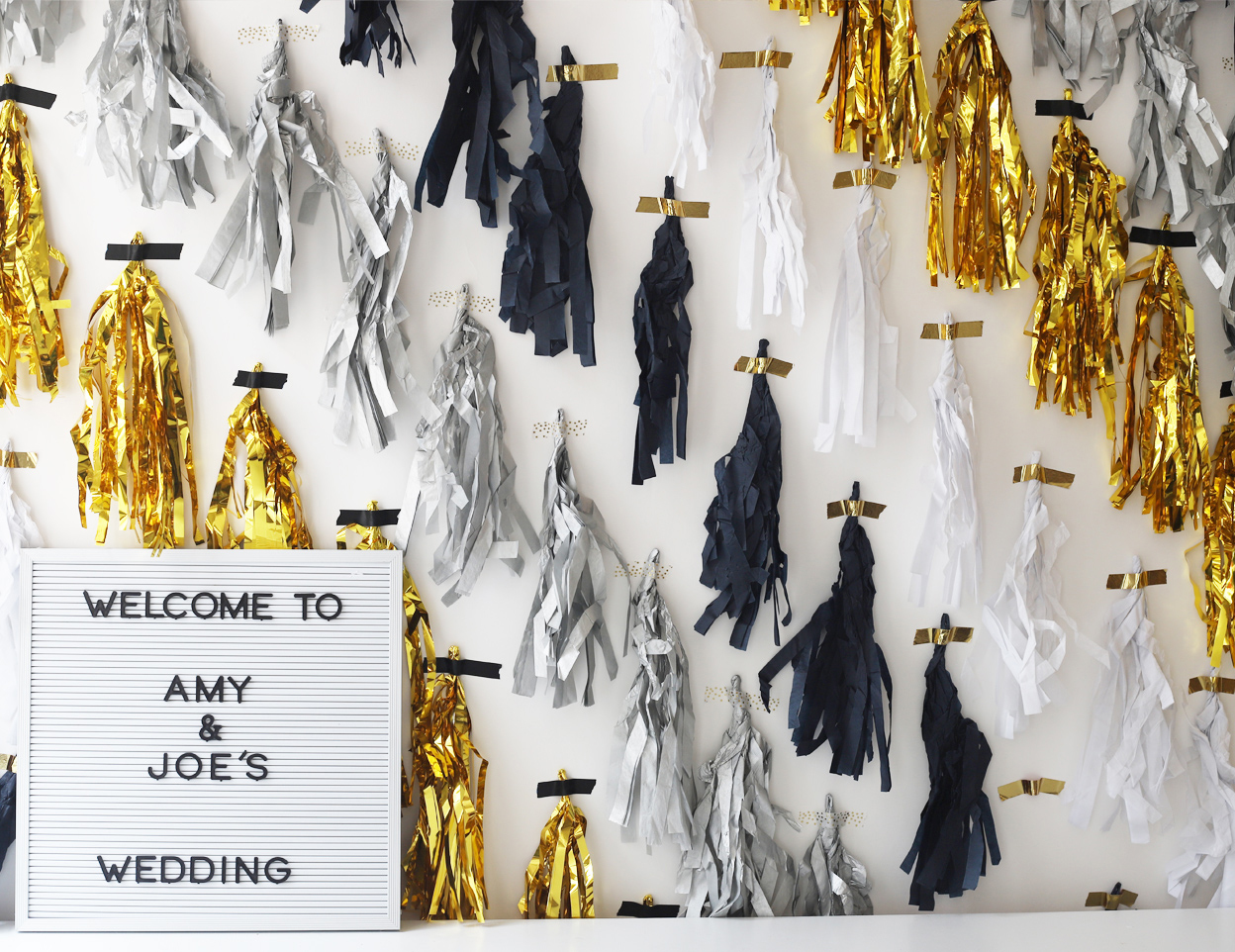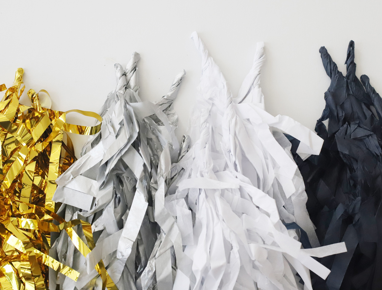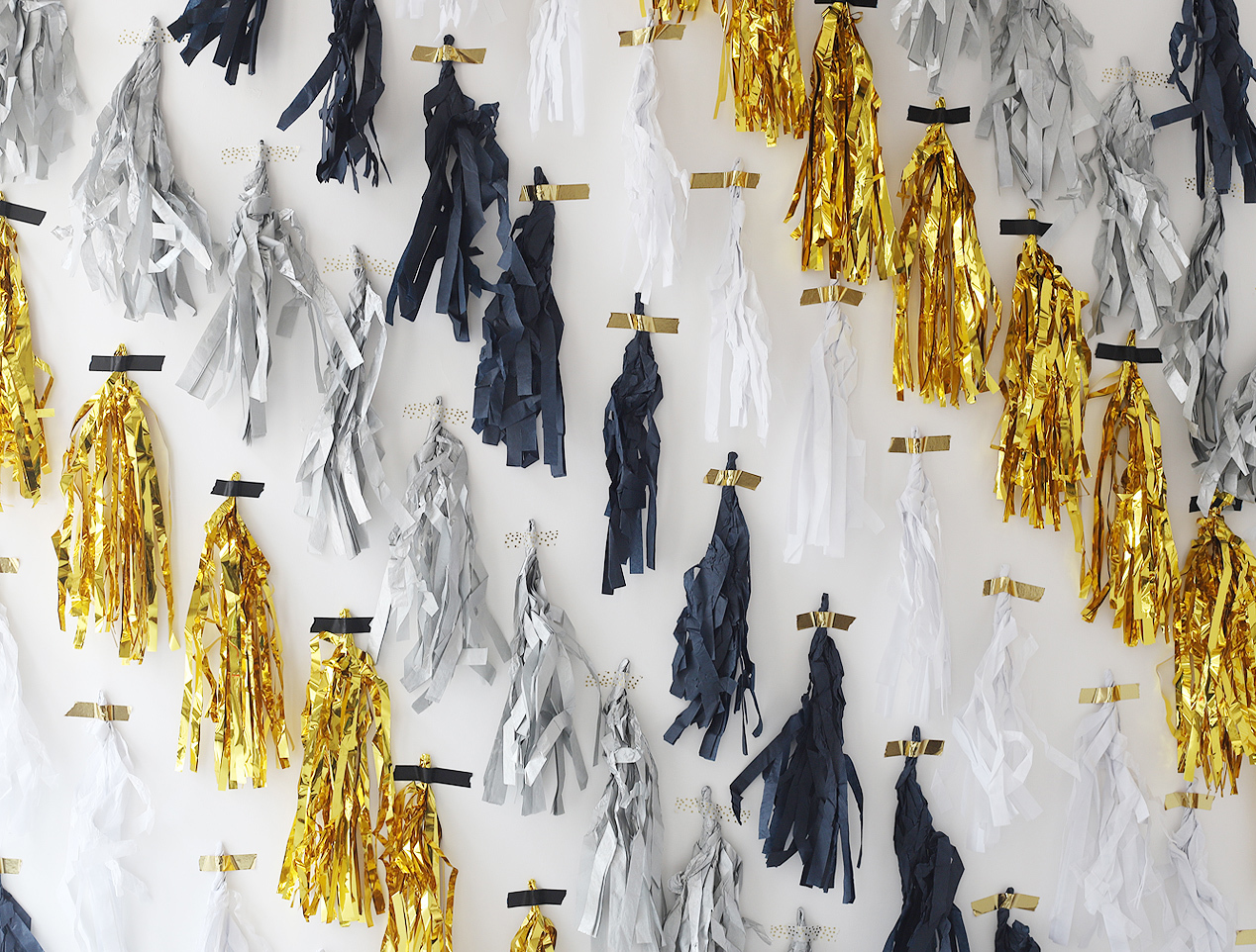 To make this diagonal pattern: start with the black tassels. Make one big diagonal stripe out of the black tassels. Next, move down the wall and tape on a diagonal stripe of the silver tassels directly underneath the black ones. Continue to move down the wall adding diagonal stripes of each color.