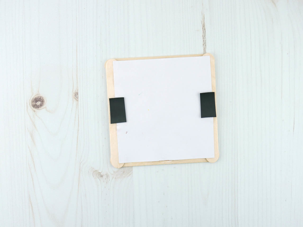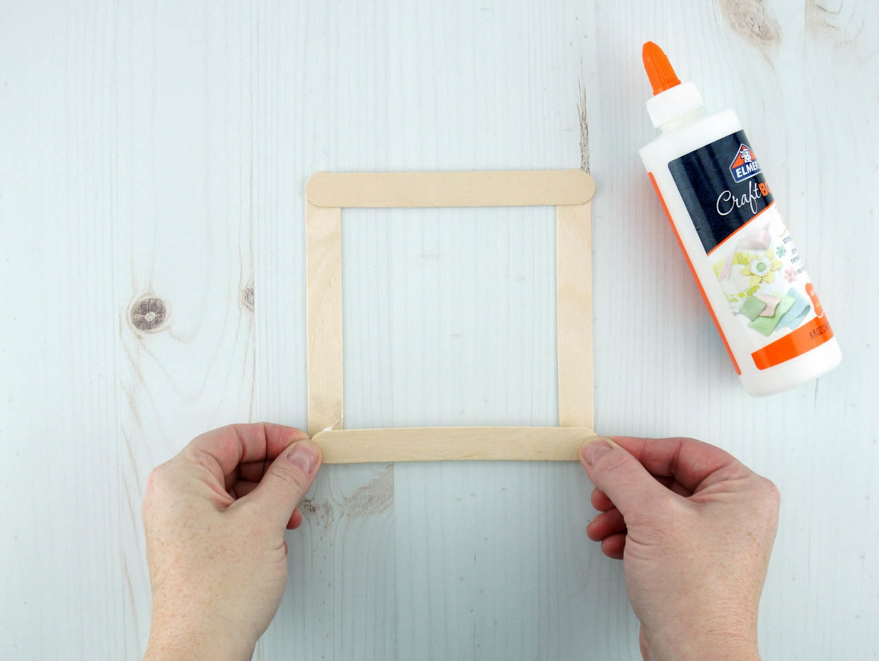Make a square frame with four wood crafts sticks. To do this, add a dot of tacky glue on the corners of two wood craft sticks. Then place two more wood craft sticks at the top and bottom of the tacky glue dots, connecting the sticks into a square shape. Set aside the frame for the glue to dry completely.