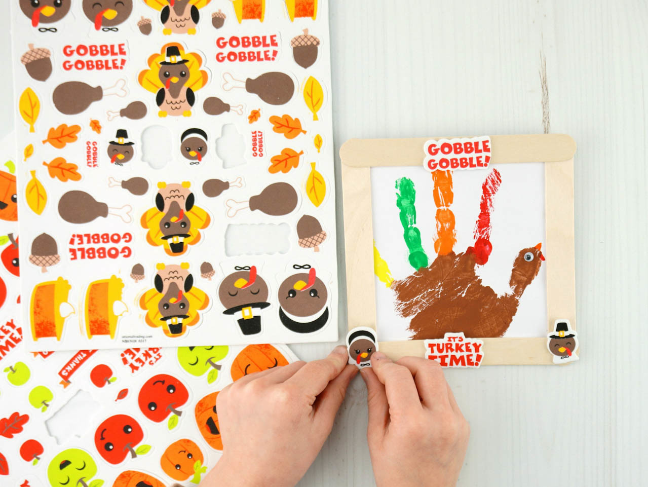 Decorate the perimeter of the wooden craft stick frame with Silly Thanksgiving Self-Adhesive Shapes.
