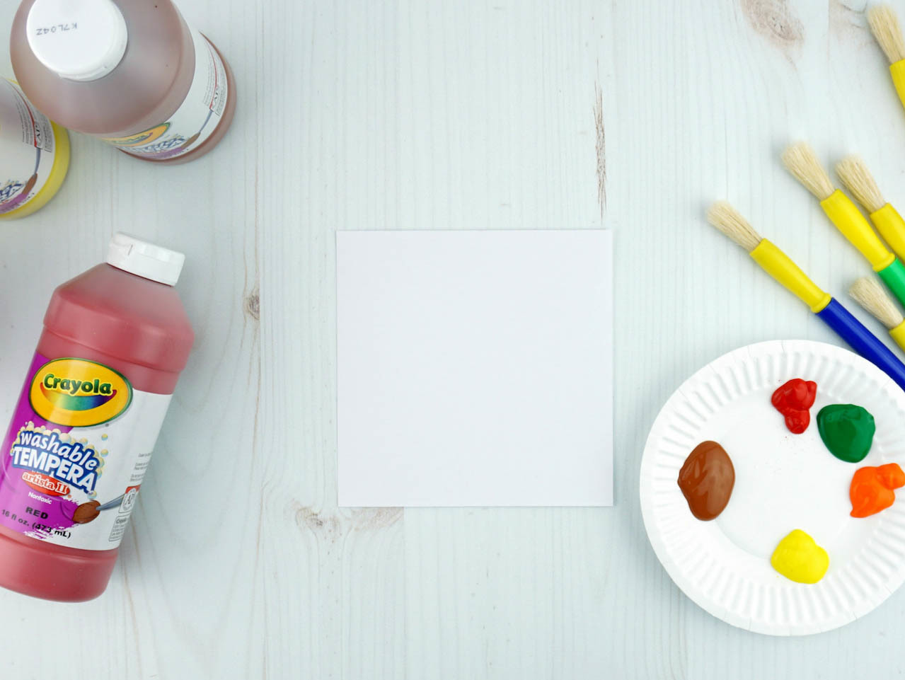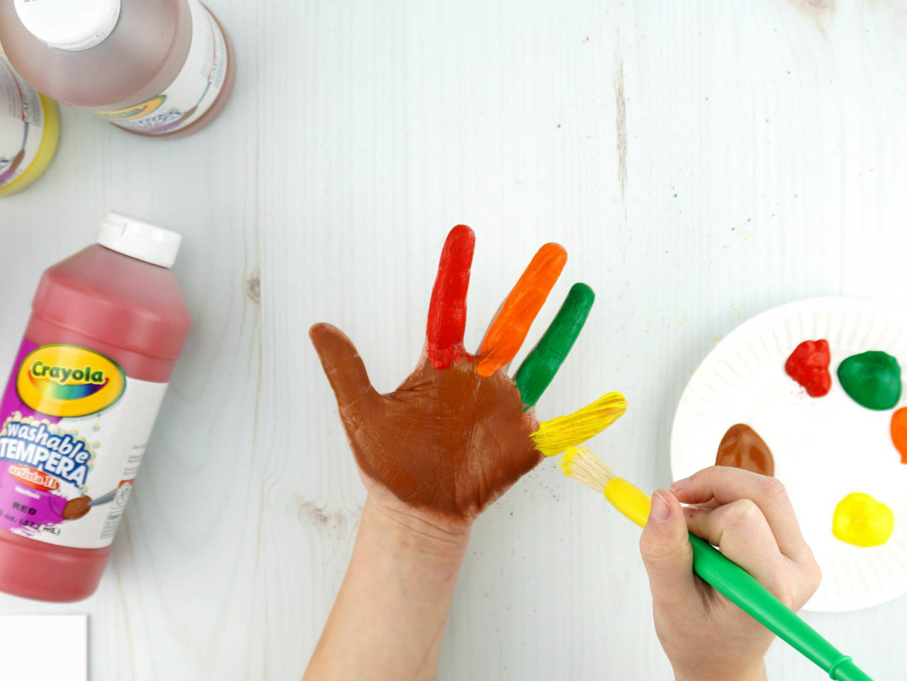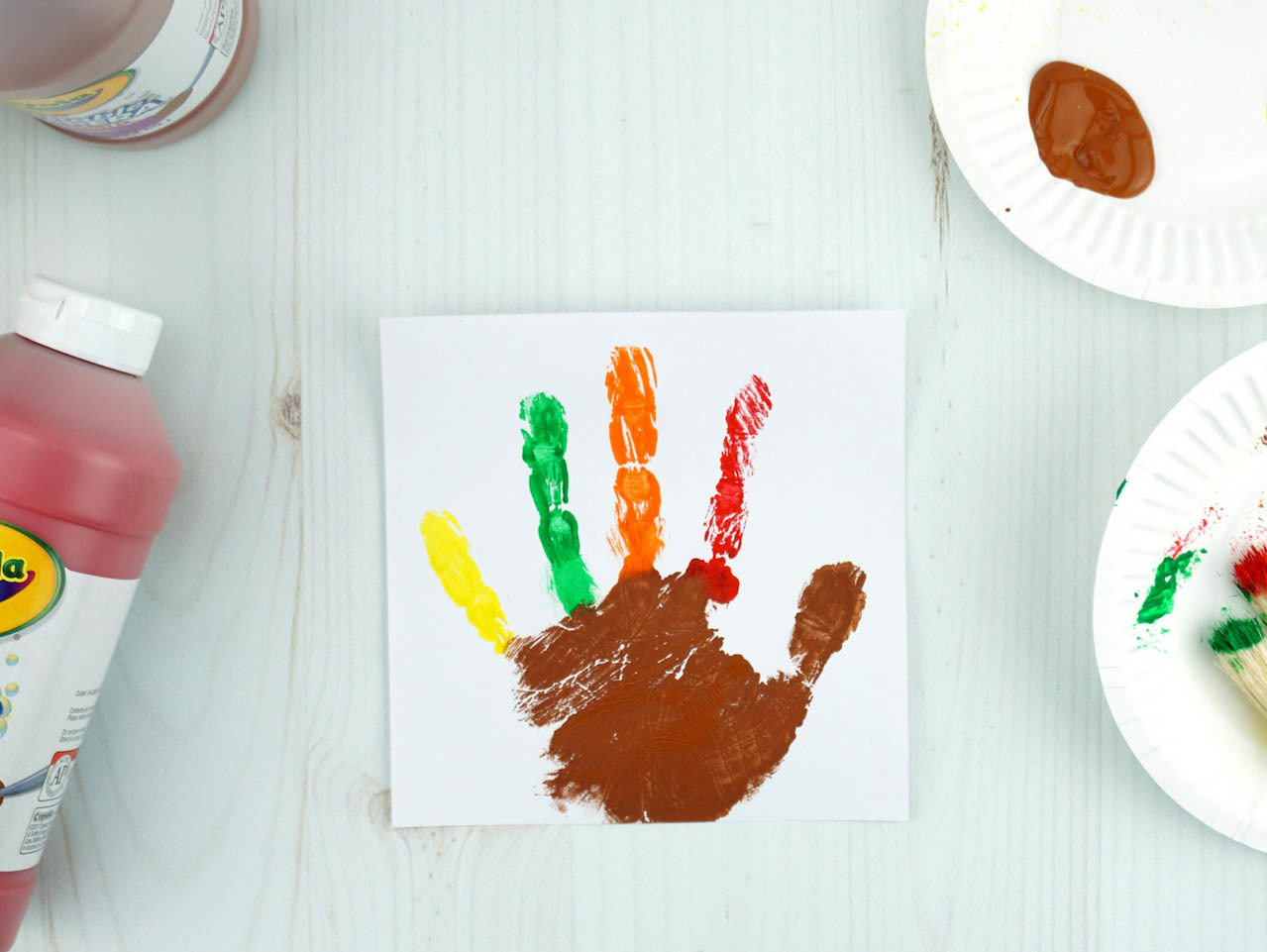 Place a small amount of brown, red, yellow, orange and green Crayola® tempera paint on a paint palette or paper plate. Let children paint their handprint with chubby paintbrushes to create their turkey. Paint the thumb and palm of the hand with brown paint. Then paint the remaining fingers with red, yellow, orange and green paint.