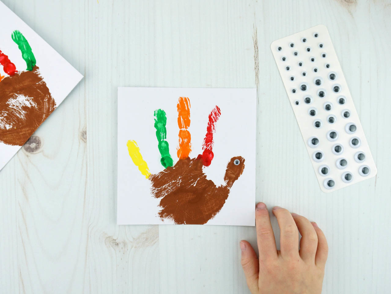 Place a self-adhesive googly eye on the thumbprint of your handprint turkey craft.