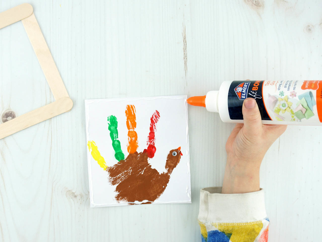 Add a thin line of tacky glue around the edge of the white cardstock square. Place your wooden craft stick frame on the glue to create a frame around your handprint turkey craft.