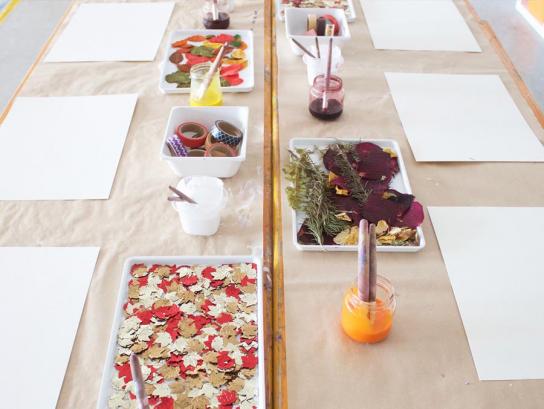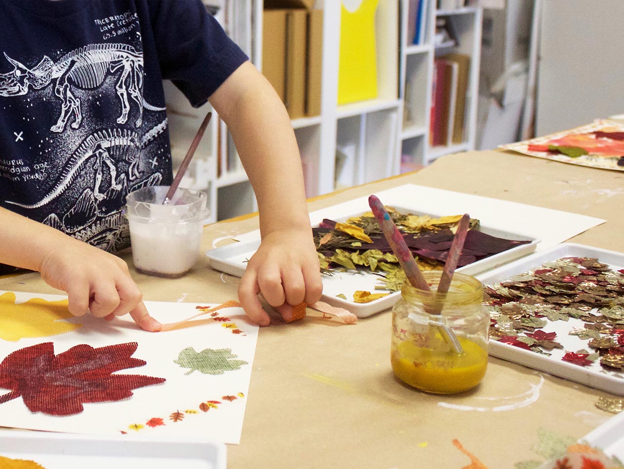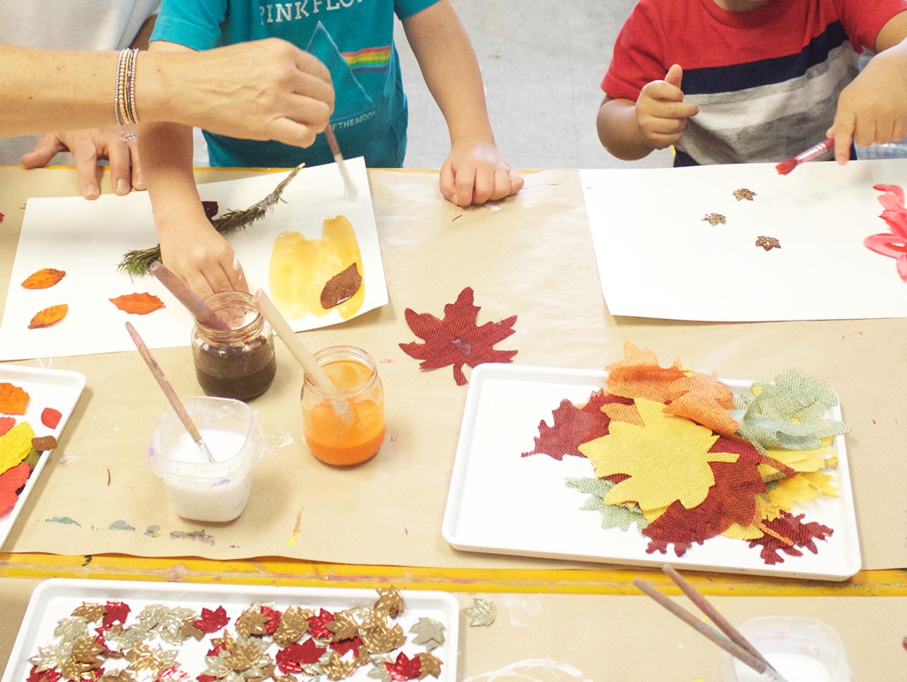 Lay out a piece of watercolor paper along with different fall inspired craft materials and natural elements. We used decorative fall leaves, tiny shiny leaves, liquid watercolors in fall colors, and fall inspired washi tape. Put out some white glue and some brushes as well. Start gluing on different materials and painting your collage.