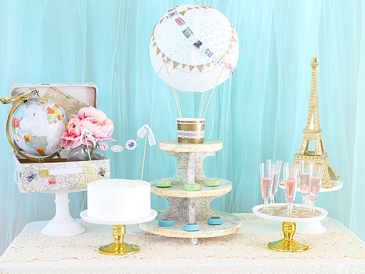 I hope you are inspired to craft your very own Travel Themed Cupcake Stand for an upcoming event! Be sure to check out all the details from my “Traveling from Miss to Mrs.” Bridal shower including my tutorials for DIY Travel Suitcase Centerpiece, DIY Hot Air Balloon Centerpiece, DIY Travel Themed Banner and Travel Themed Chocolate Covered Oreos! Styling, Projects and Photography by Michelle Stewart of Michelle’s Party Plan-It.