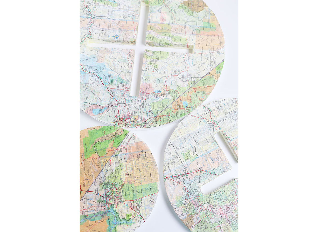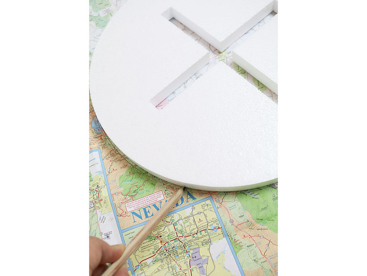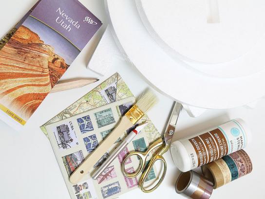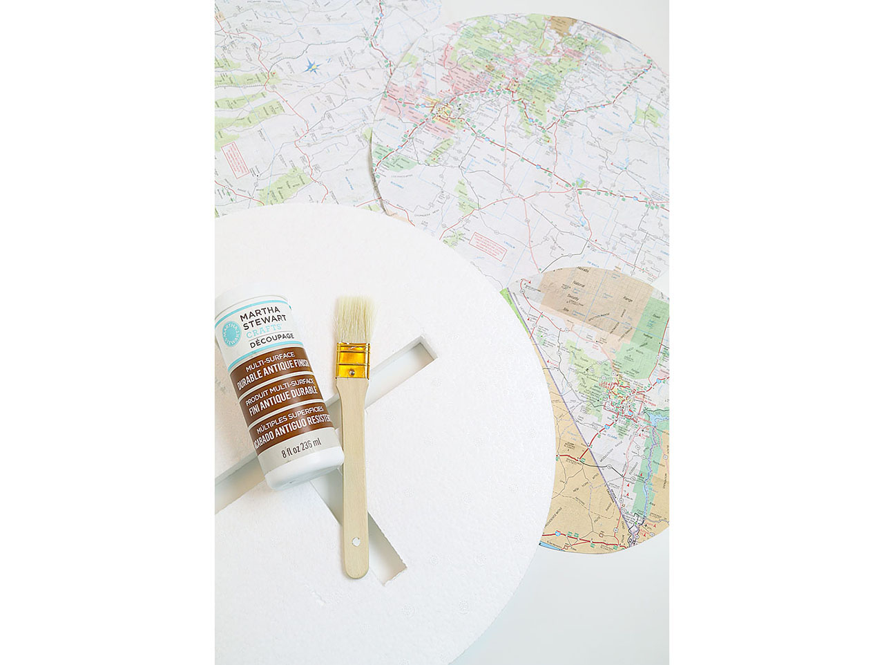 Apply a generous amount of Martha Stewart Crafts® Découpage – Antique Finish with a brush and adhere the maps to the foam. Apply pressure to smooth out any wrinkles. On the two bigger circles, using an Exacto knife; carefully cut a slit down the middle of the circle as to not cover the opening. Fold and decoupage the paper down into the slots to keep smooth. Leave the small circle untouched so you can have a flat top surface.