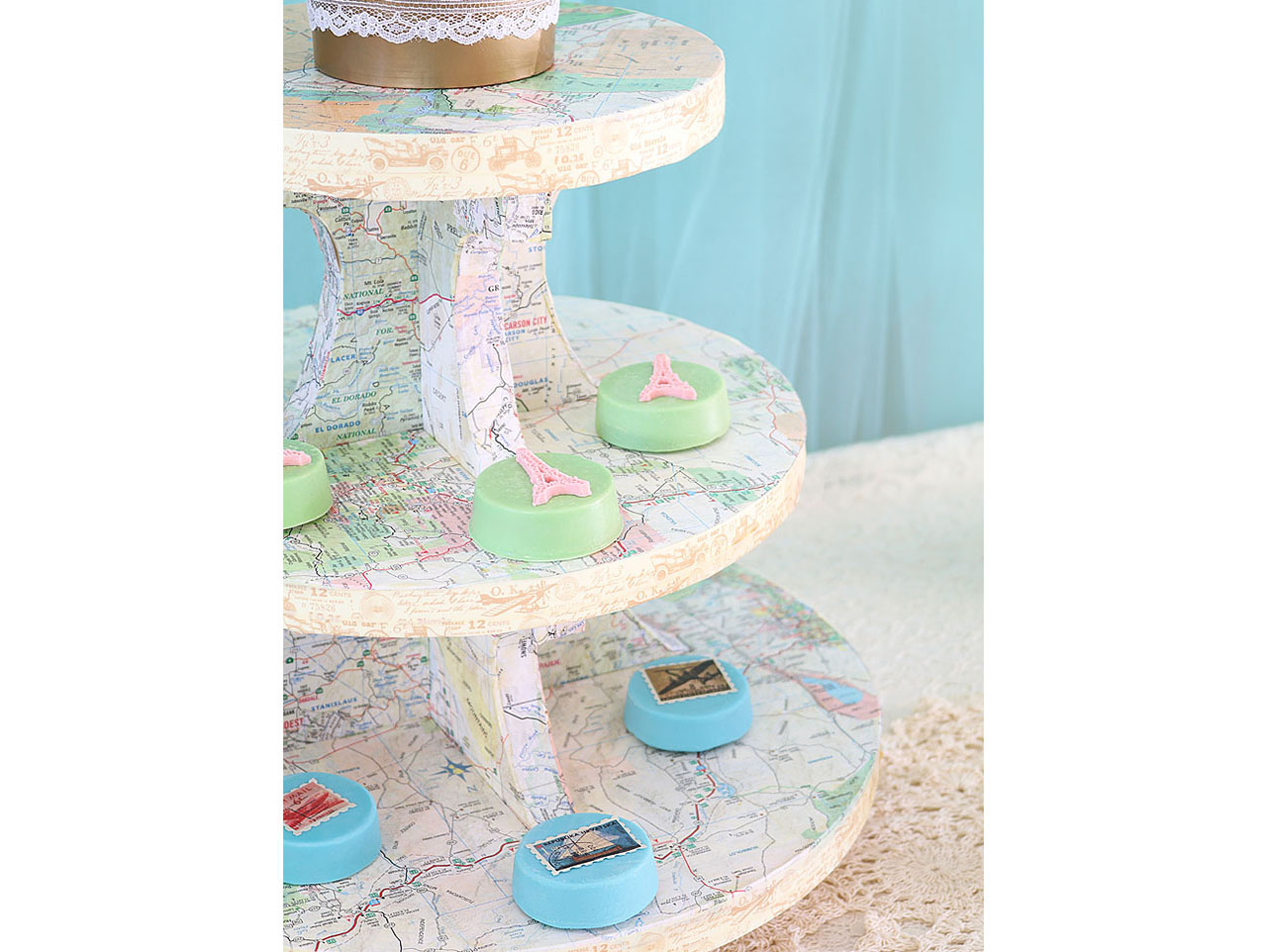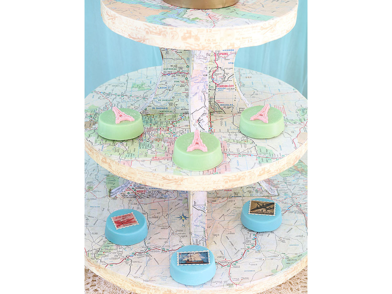 Decoupage strips of paper to the edges of the stand pieces and cover the edges of the circles with Travel Washi Tape. Once dry, assemble the cupcake stand. Add your favorite treats and you’re all set!