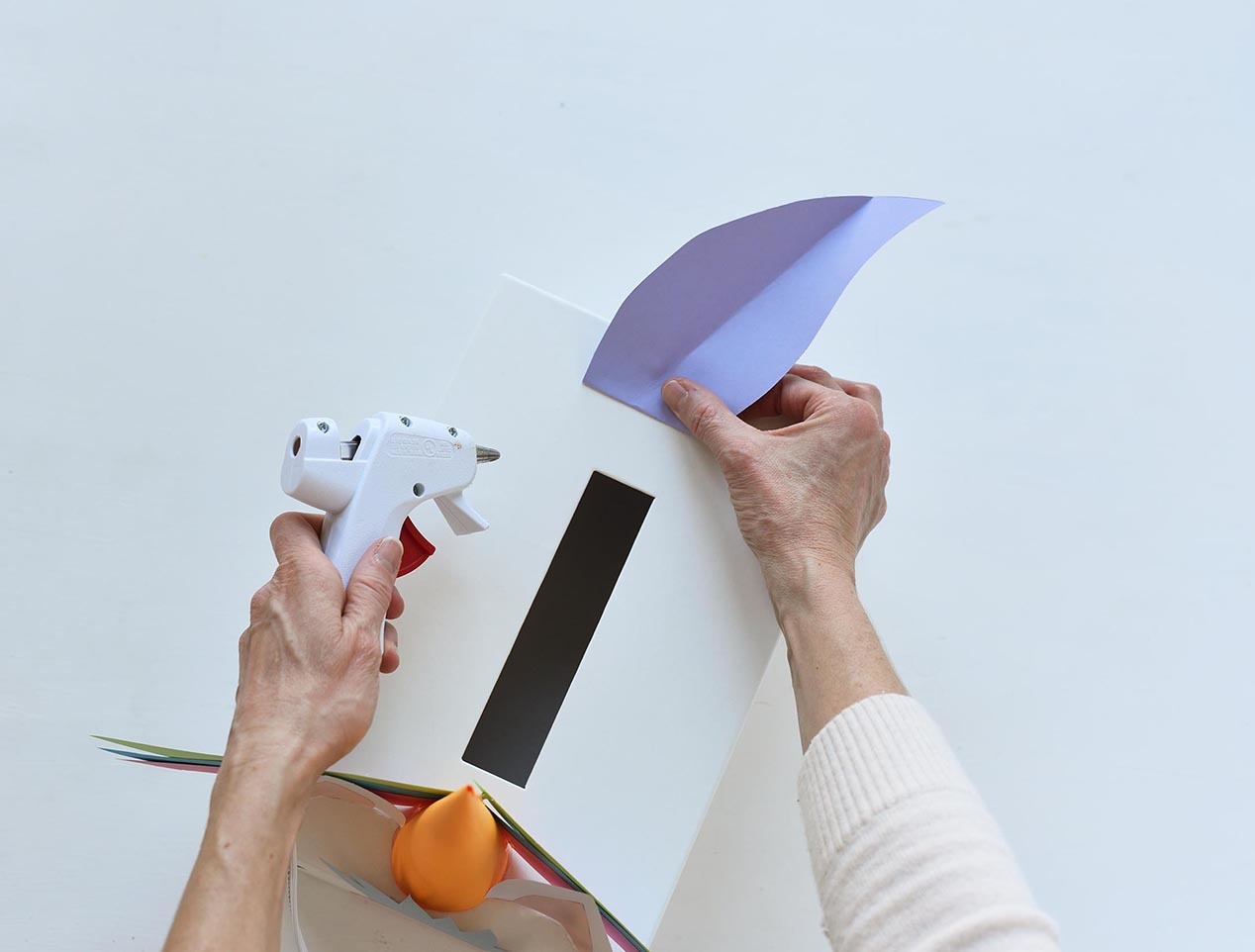 Glue the horn onto the top of the box using the hot glue gun. Adhere the ear pieces (glue the pink smaller ear pieces to the larger white ear pieces and fold in the middle slightly) on either side of the horn. Glue the mouth, eyes and hair using a glue stick.