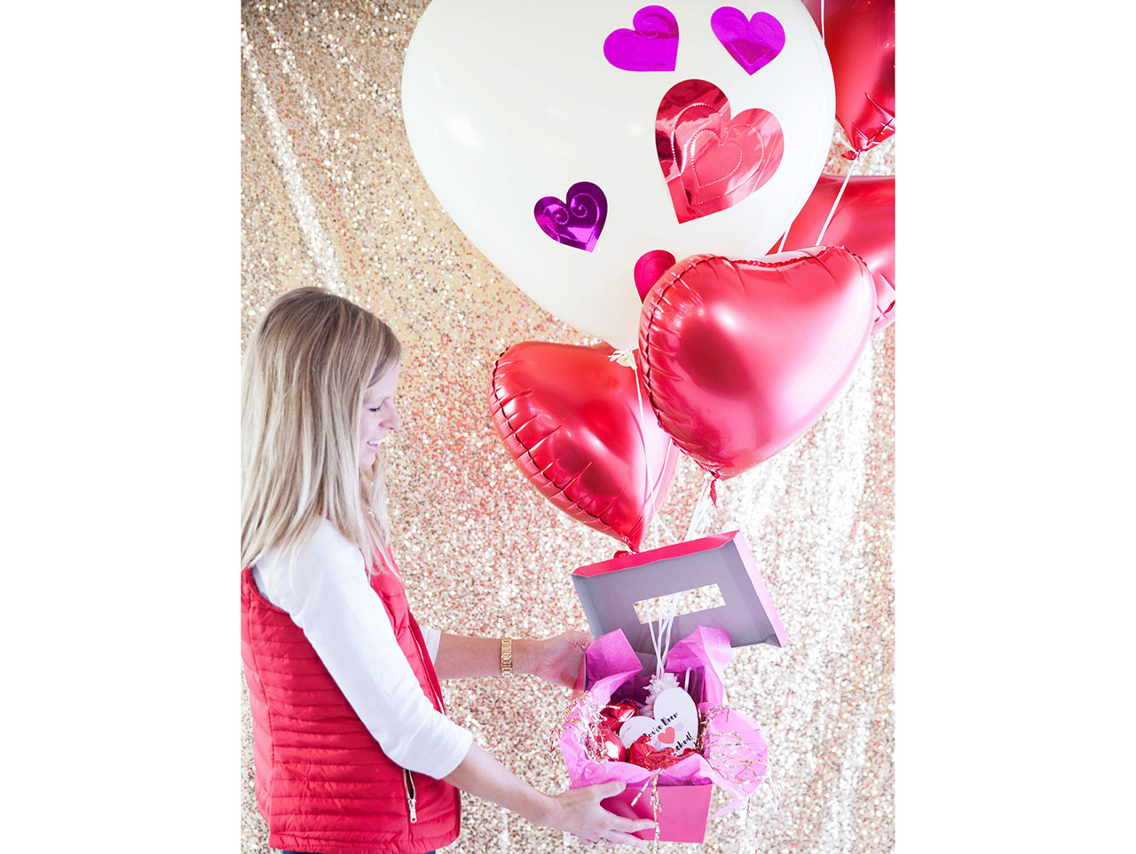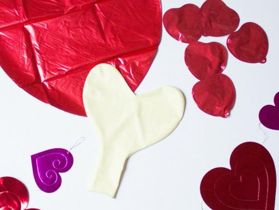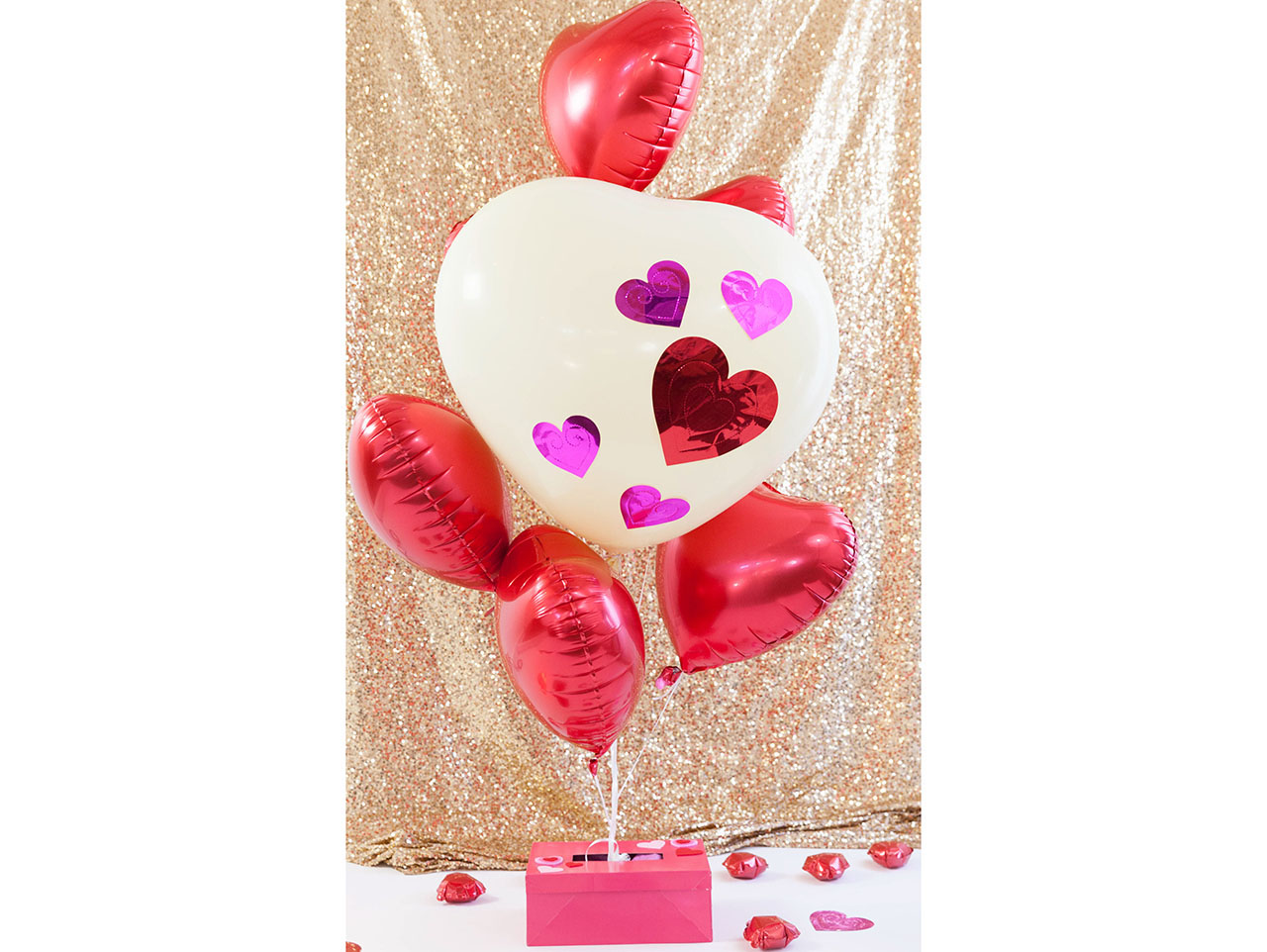 Inflate the balloons either with a personal helium balloon tank or at your local party store. This bouquet uses one jumbo heart balloon and five Mylar heart balloons, but you can include as many as you want! I decorated my large balloon with a few hearts from this garland by affixing them with double-sided tape. You can also tie a length of the heart garland to the large balloon for a pretty balloon string. Finish by tying the balloons to a balloon weight.