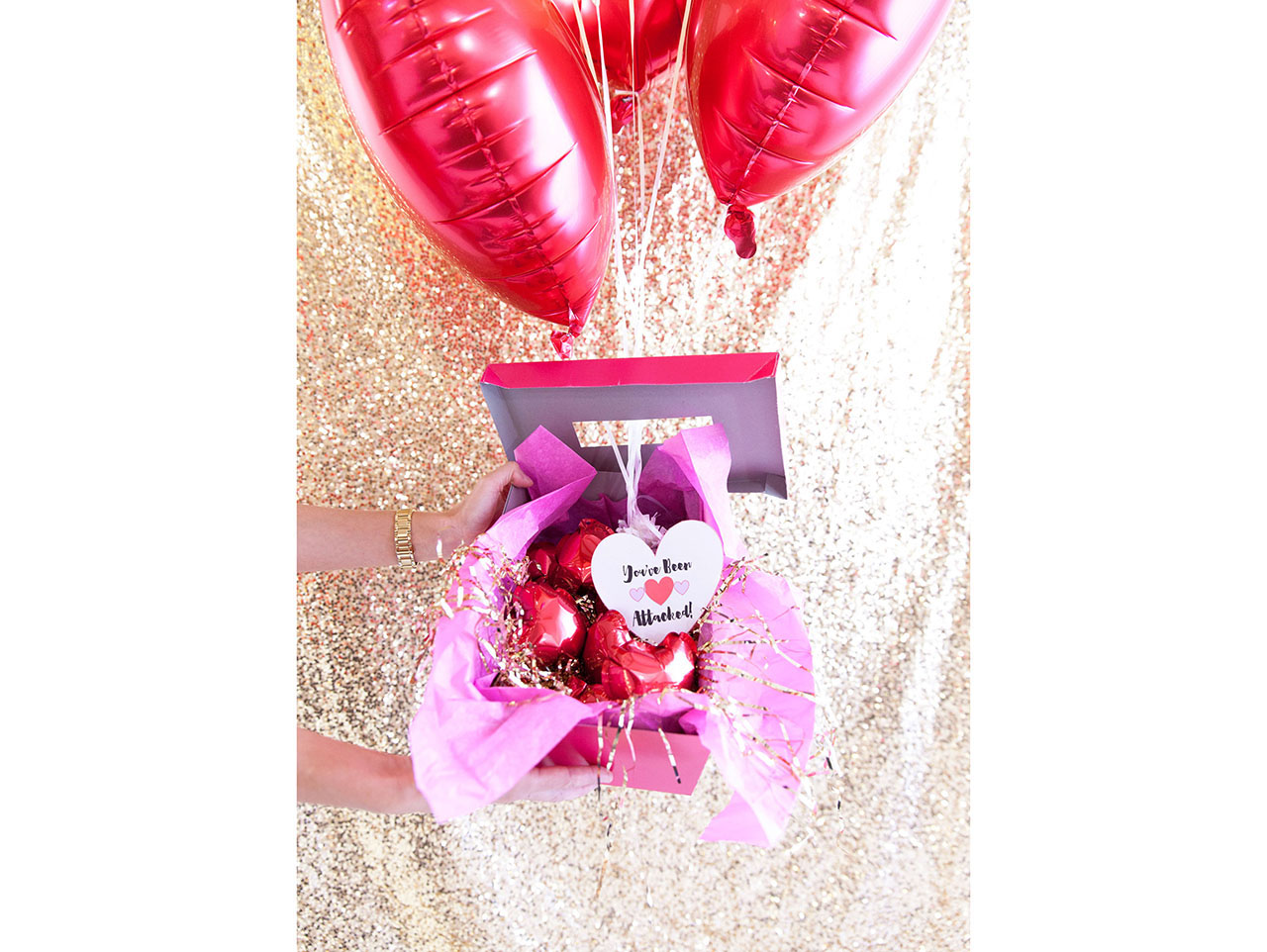 Fill the Valentine card holder box with the little heart balloons and some pretty filler such as tissue paper or Mylar shred. Insert the balloon weight through the hole on the top of the lid, and finish with a little note that says “You’ve been heart attacked!”.