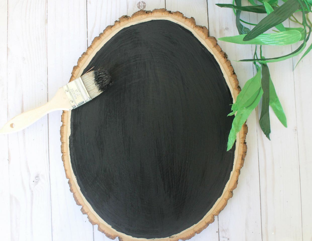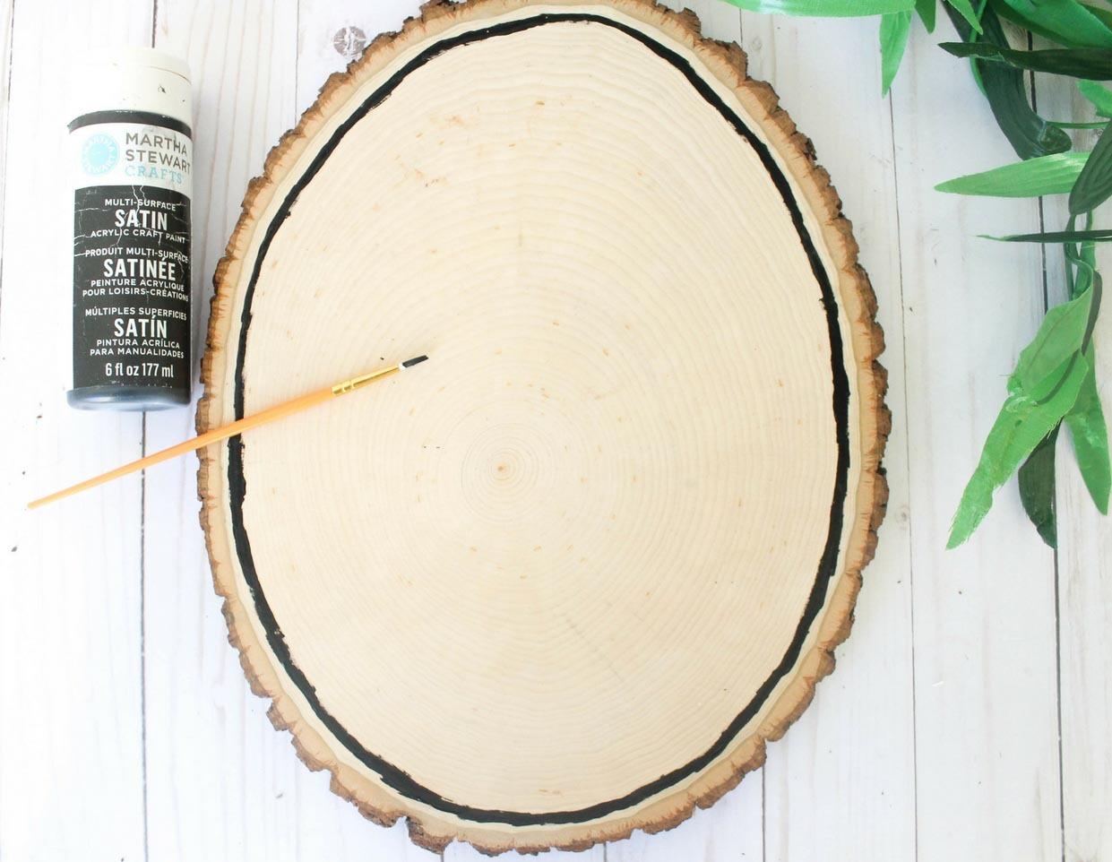 Using a thin paintbrush, paint a black, circular outline around the Large Round Wood Centerpiece, leaving approximate 1/4" of space between the bark of the Wood Centerpiece and your paint line. Once the outline is done, fill in the interior of the circle with Black Acrylic Paint. Allow to dry.