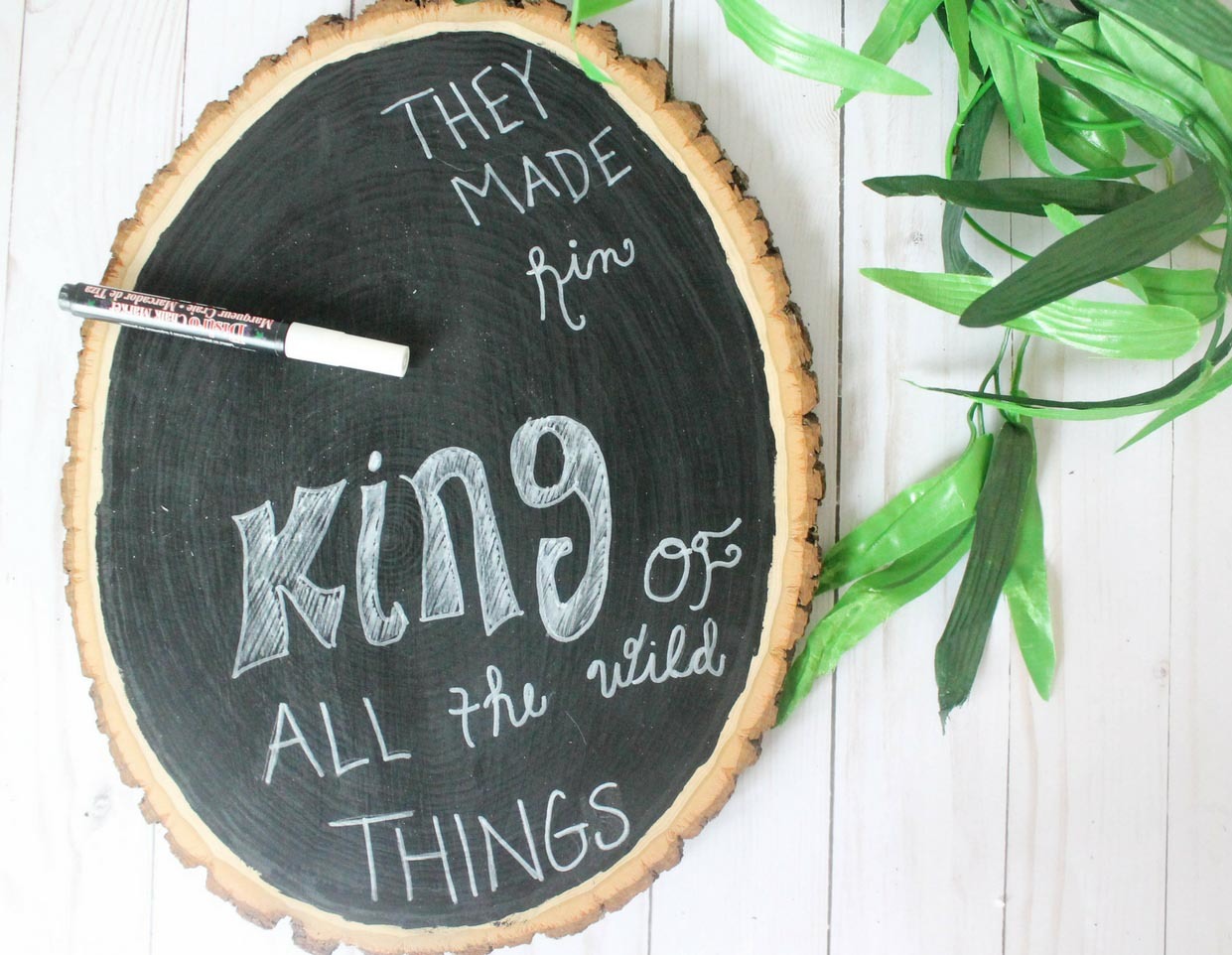 Once the black paint has dried, take the Bistro White Chalk Marker and carefully write the quote, "They made him king of all the wild things" on the painted portion of the Wood Centerpiece. Try using a few different lettering techniques (cursive, block letters, shading) to really bring the quote to life! Make sure to leave a bit of space above the word "king" for some detail to be added in our next step.