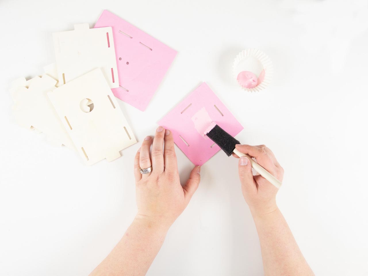 Whitewash the walls of the DIY Unfinished Wood Birdhouses using a mix of 70:30 white acrylic paint to water and a large flat bristled paint brush. Paint the roofs and bottoms of the birdhouses with pastel acrylic paint.