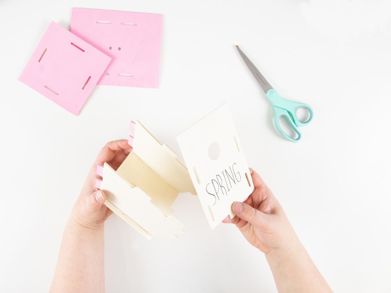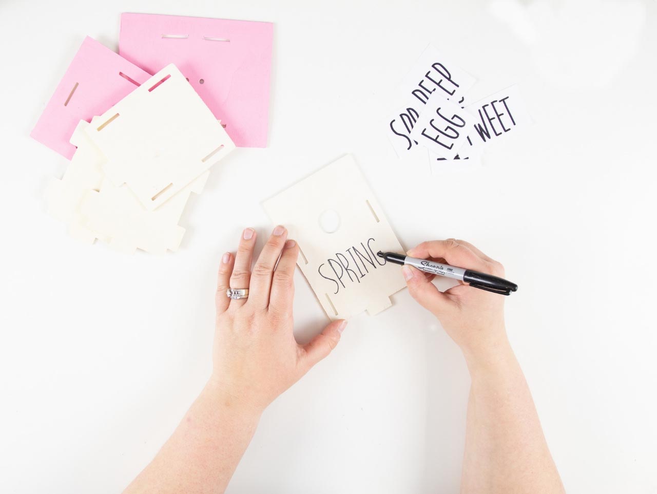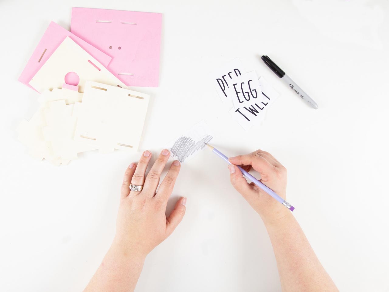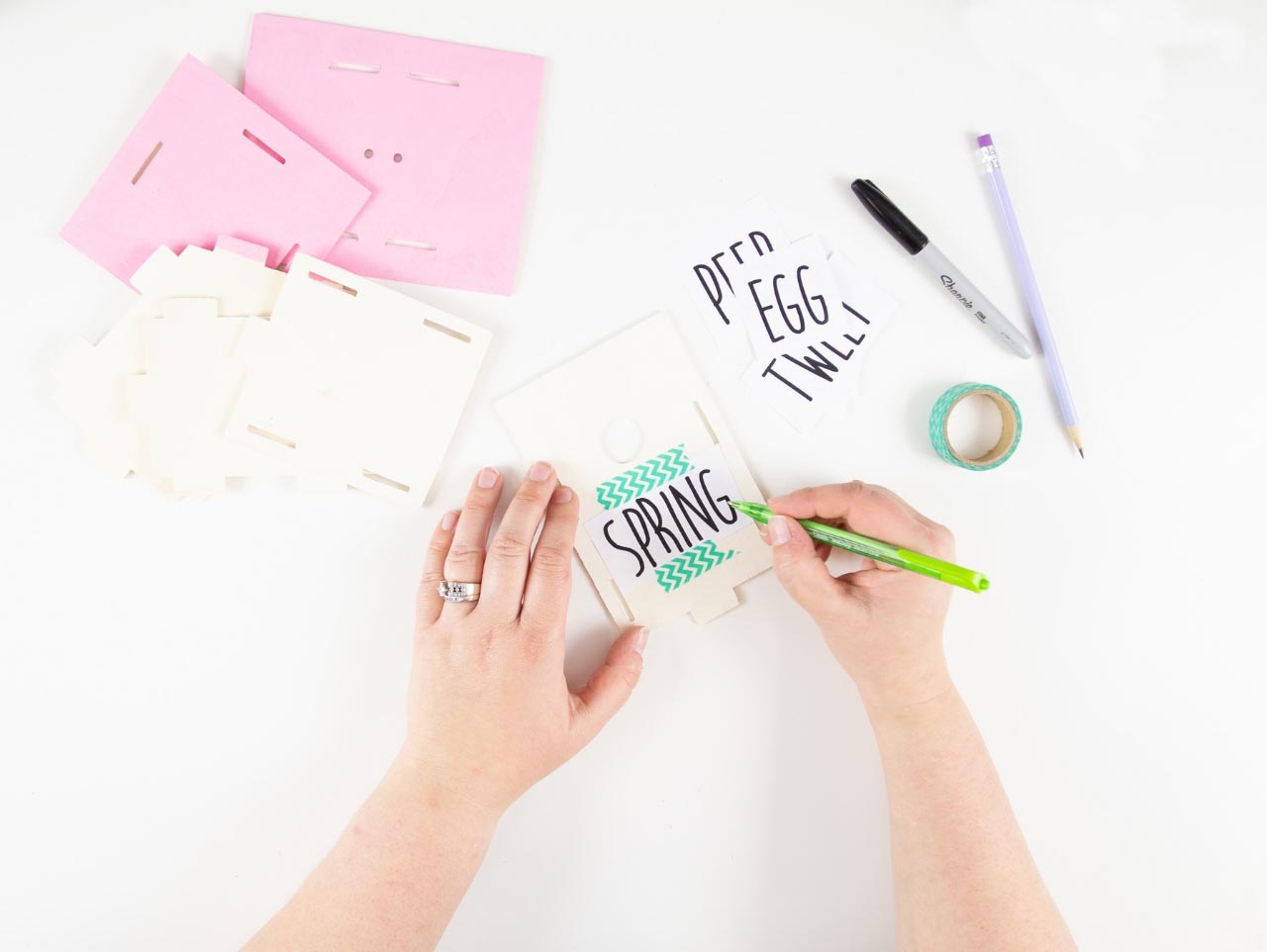 Once the paint is dry, print and cut out the Rae Dunn Inspired Easter Words Template. Rub a pencil onto the entire back of the cut out word. Use washi tape to place the word onto the front birdhouse panel. Use a ballpoint pen to trace the letters on the printable. This will transfer the word onto your project. Download the Free Template here!