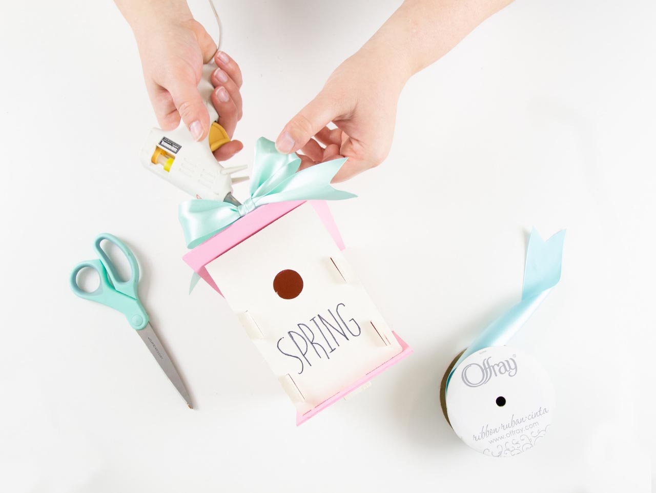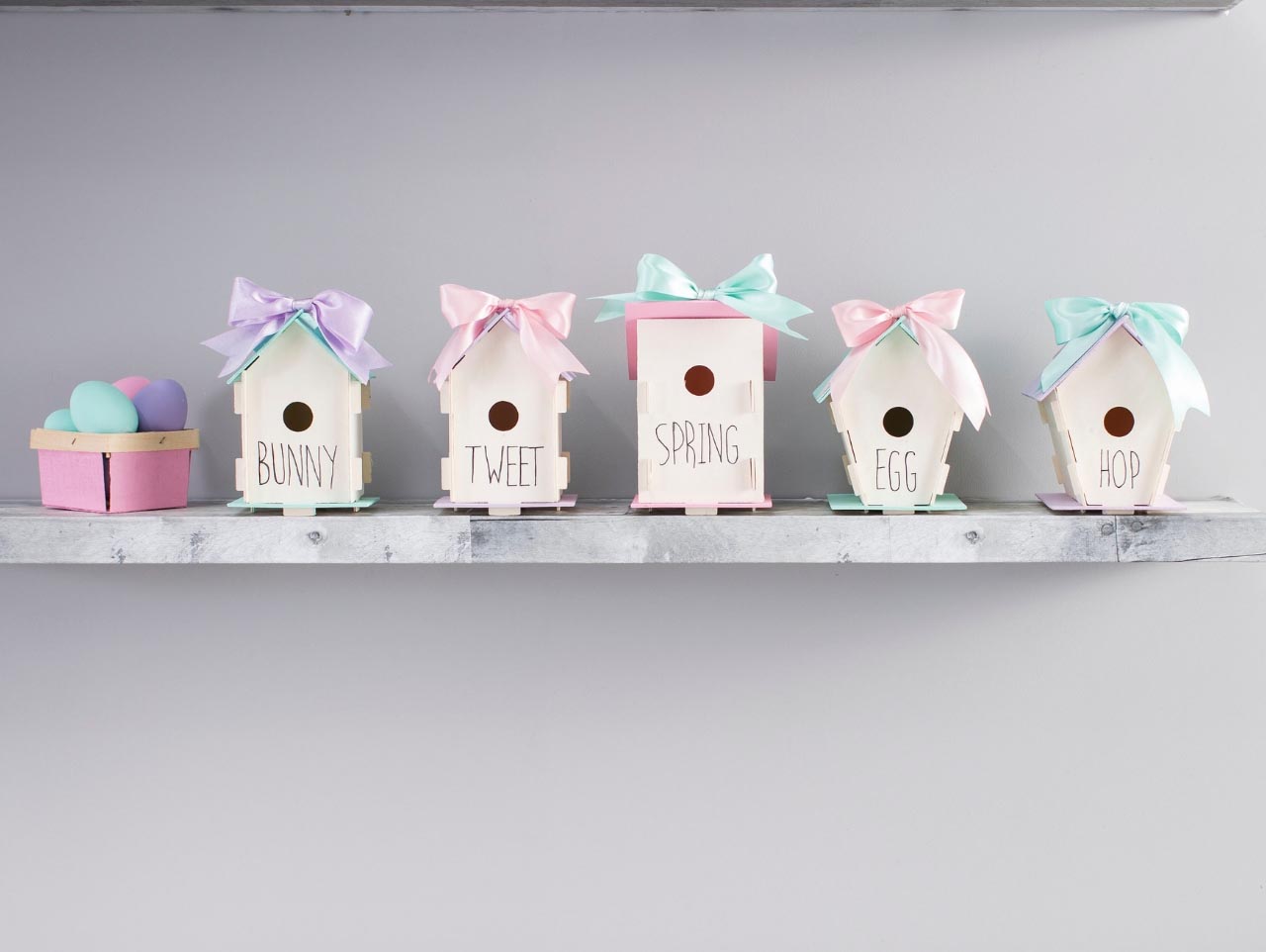 Assemble the birdhouses and tie a pastel satin ribbon bow to the top of the birdhouse using a glue gun.