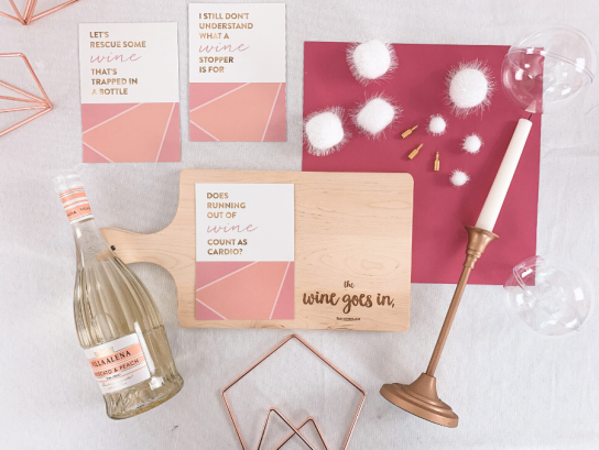 Begin by downloading and printing these Sassy Wine Signs. Use a paper trimmer to cut them out, then tuck them inside Rose Gold Geometric Sign Holders. Set aside.