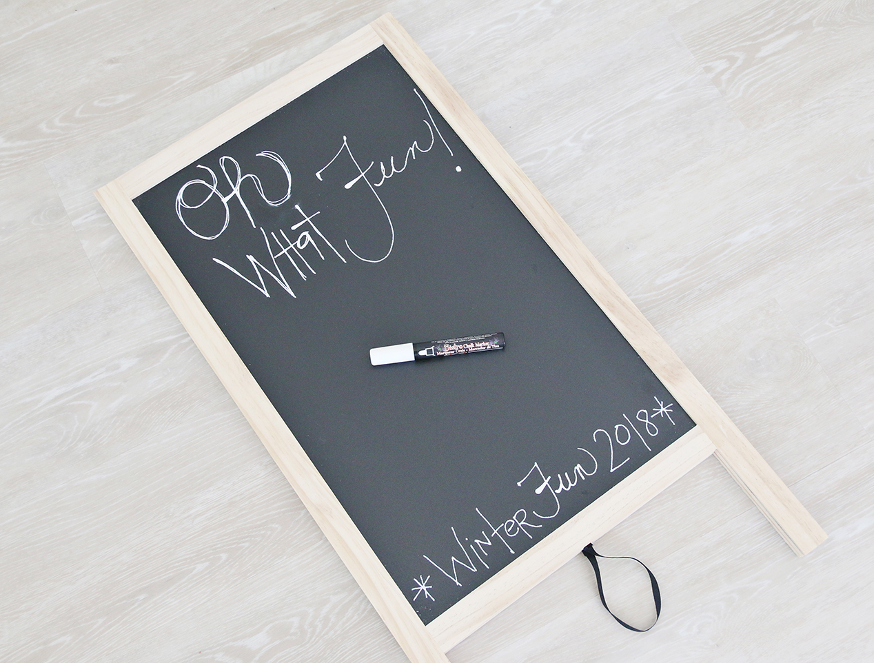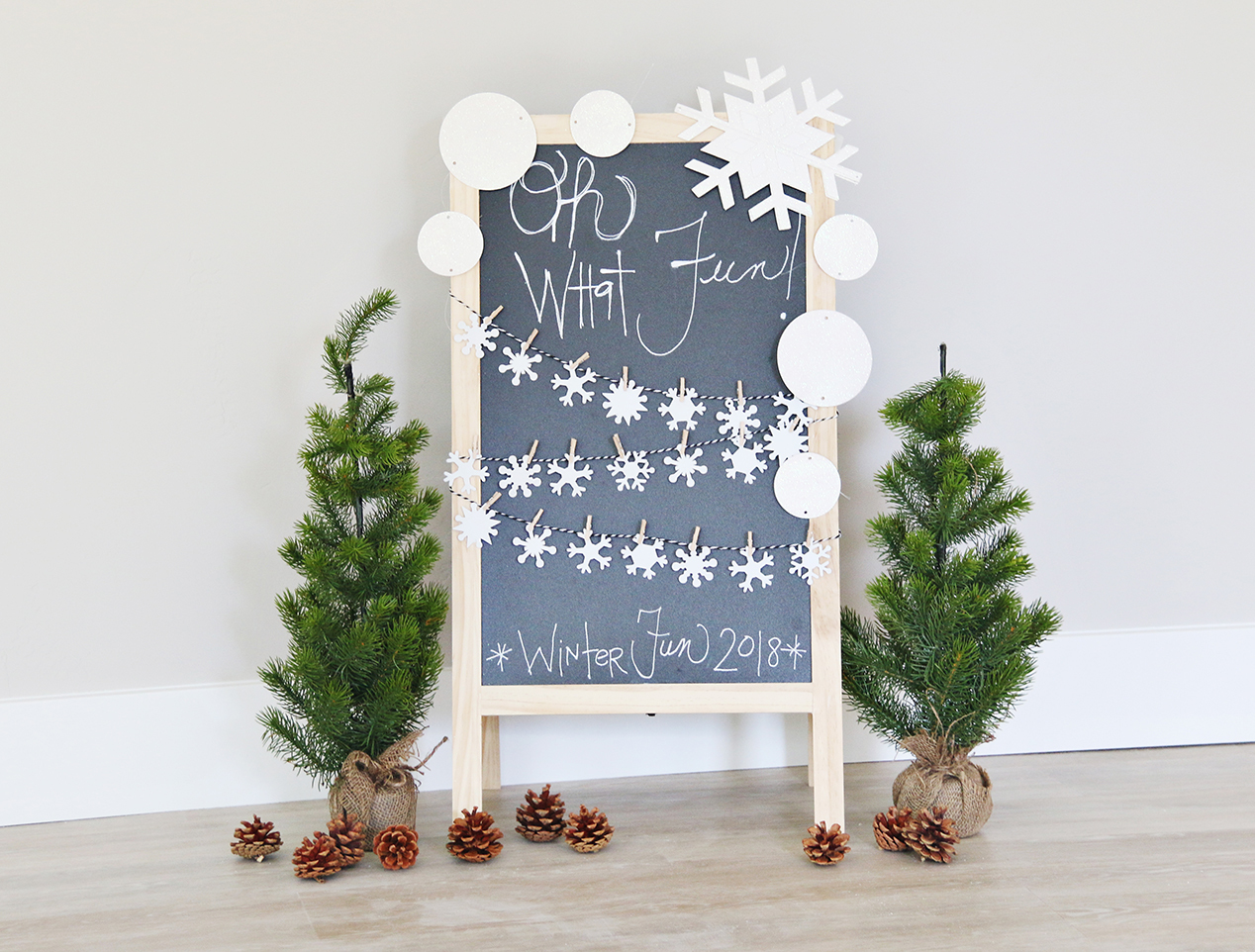 Using a White Bistro Chalk Marker, Add wording to the chalkboard easel that reads..."Oh What Fun! And Winter Fun 2018" (or the current year). Try mixing in some regular handwriting with cursive.