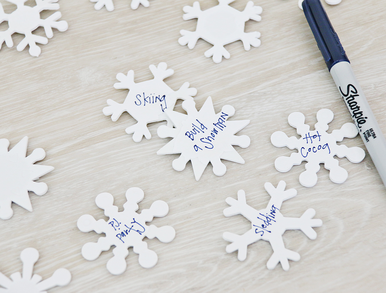 Write fun winter activity ideas on the back of each snowflake. Have your family get together to decide on the activities. Use a fine point sharpie marker to write down the ideas on snowflakes.