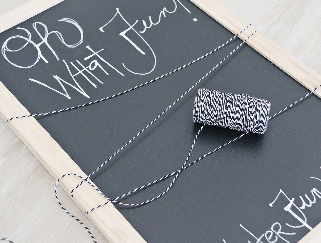 Hang black baker's twine in a zig-zag pattern down the middle of the chalkboard easel. Use tape to adhere to the backs and side of each zig-zag piece.