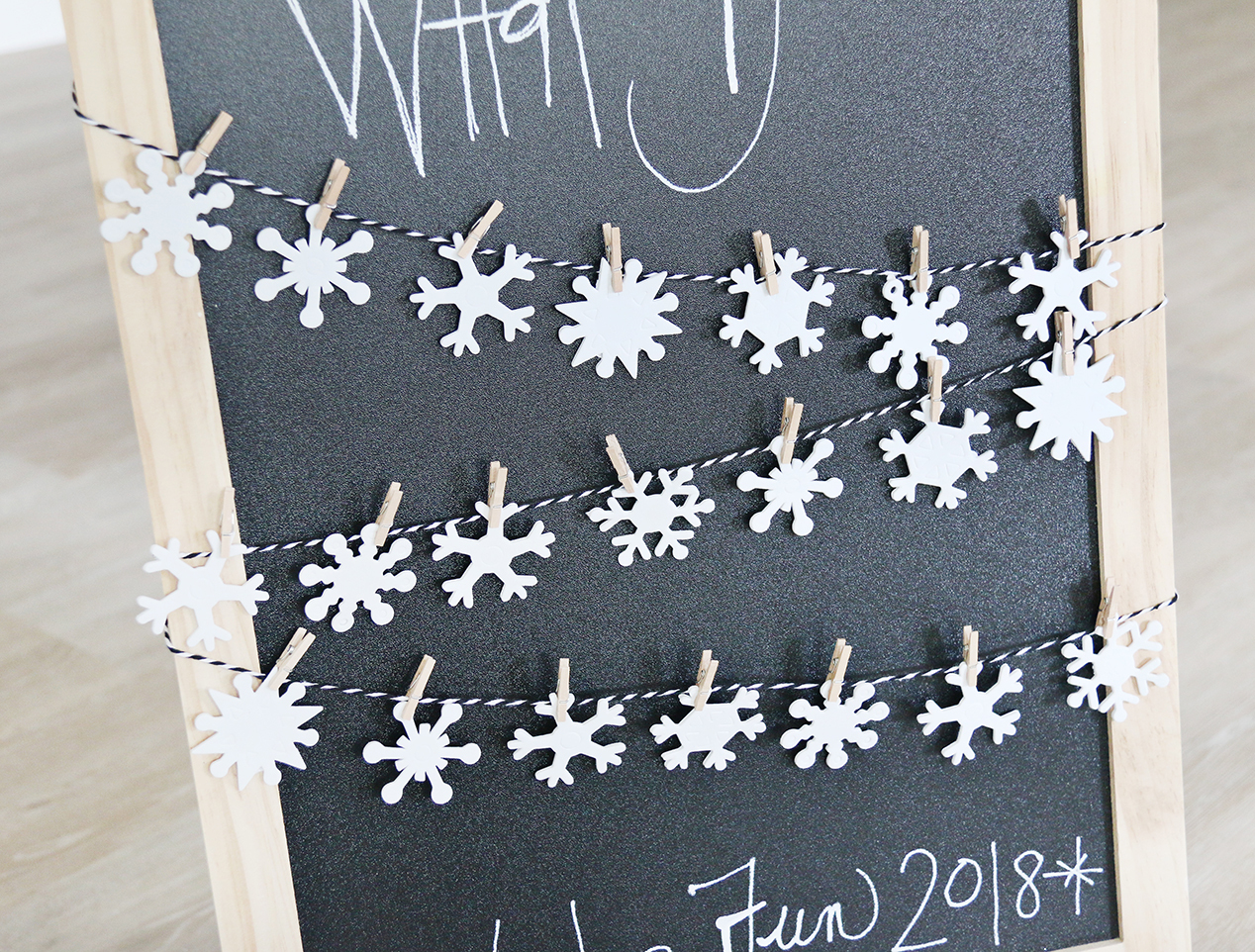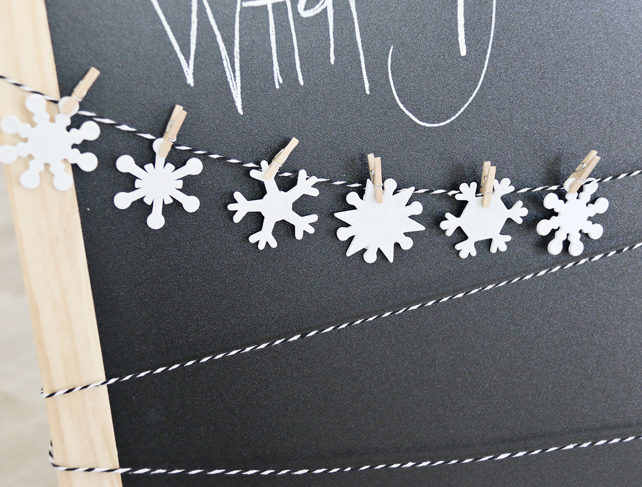 Using mini clothespins, hang the white snowflakes along the baker's twine until you fill up the lines of string.