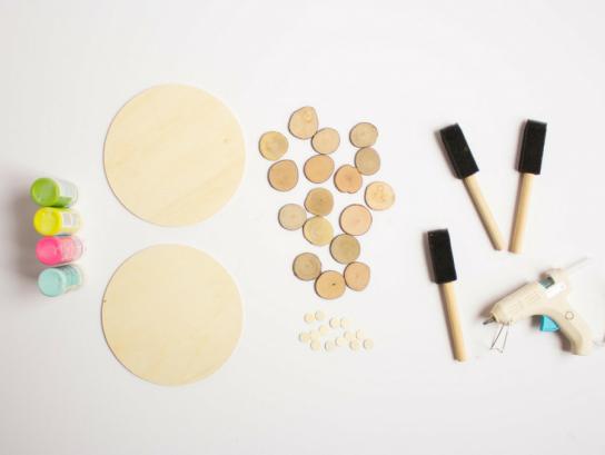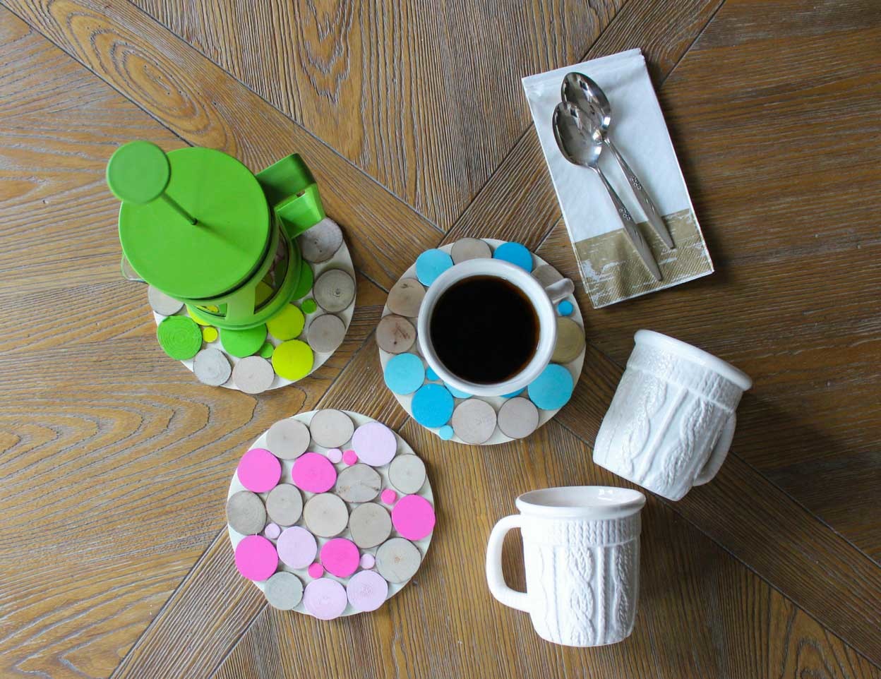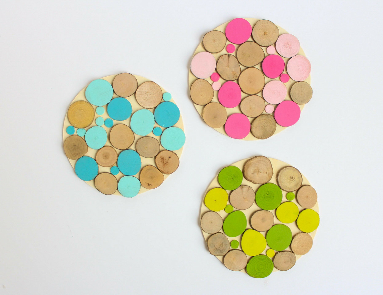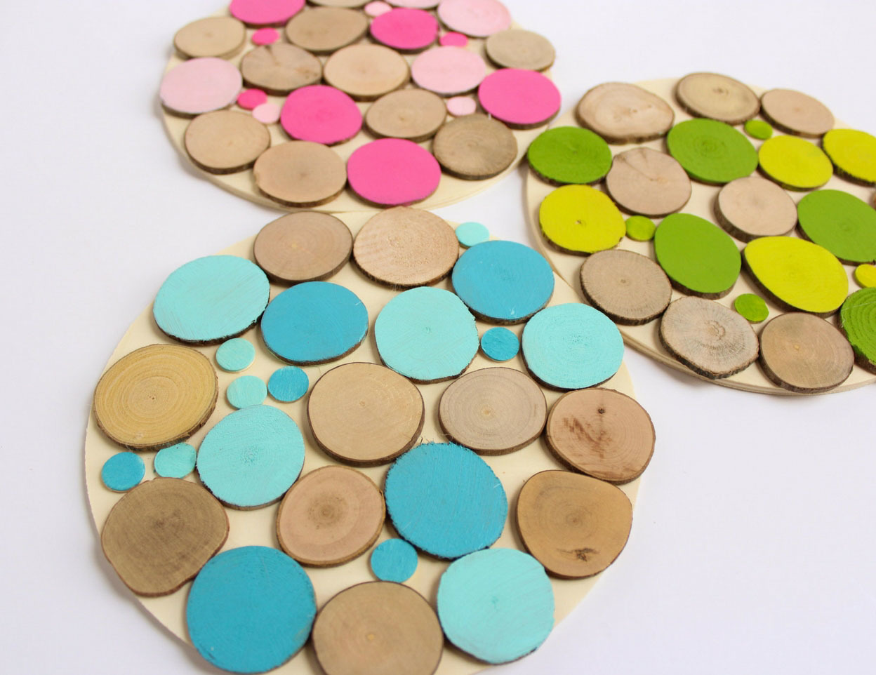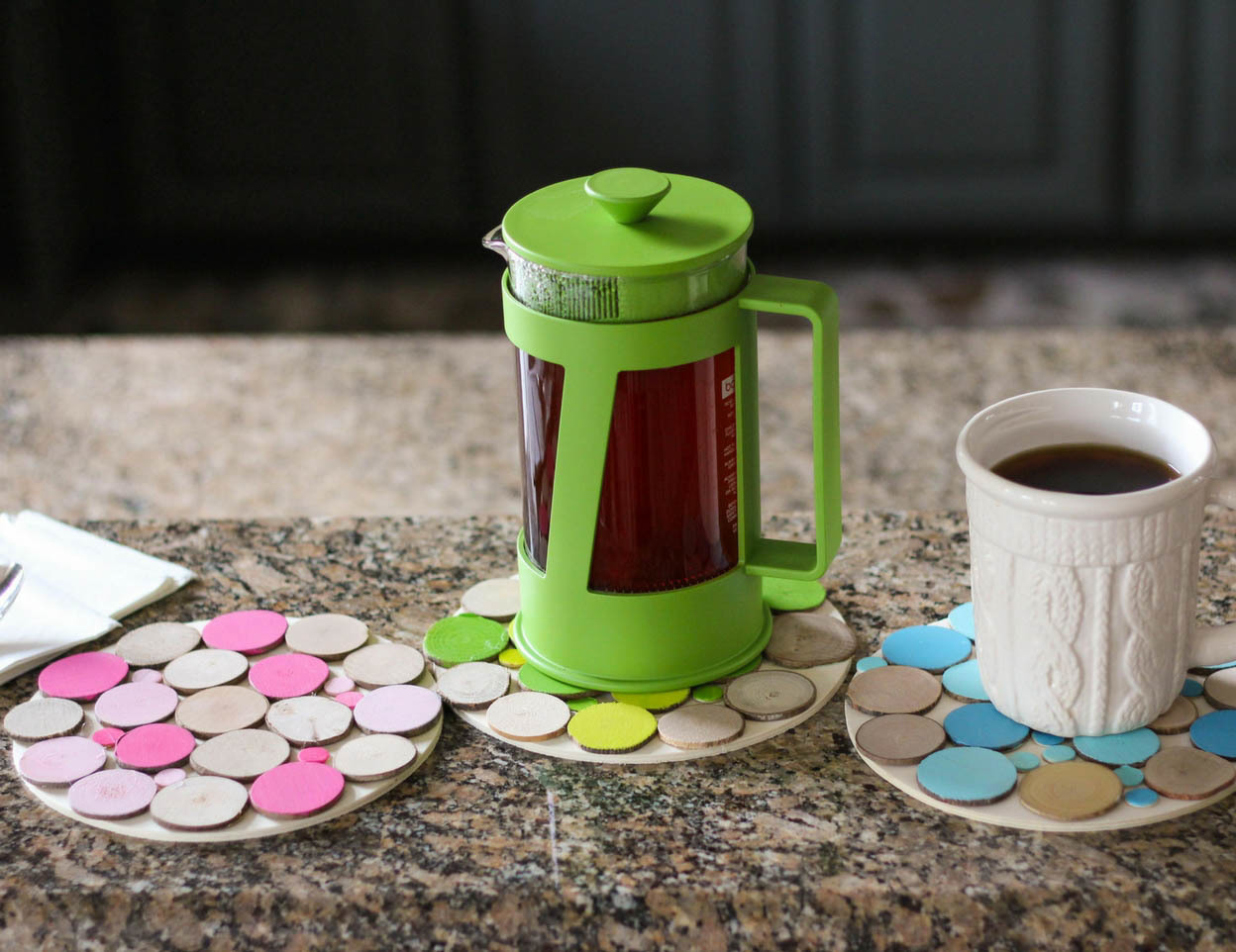 Hot glue the wood slices to a wood disc by apply a dab of glue to the backside of each wood slice. Start around the outside edge of the wood disc, and alternate the painted and unpainted wood slices in a random pattern as you fill in the disc. Position the wood slices close together and fill in any gaps between the wood slices with small wood circles. If you like, you can repeat the process to make a set of trivets in different colors.