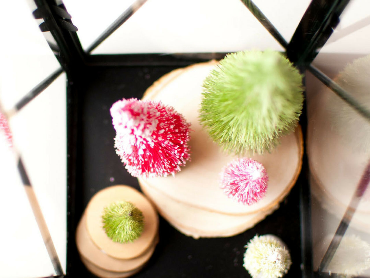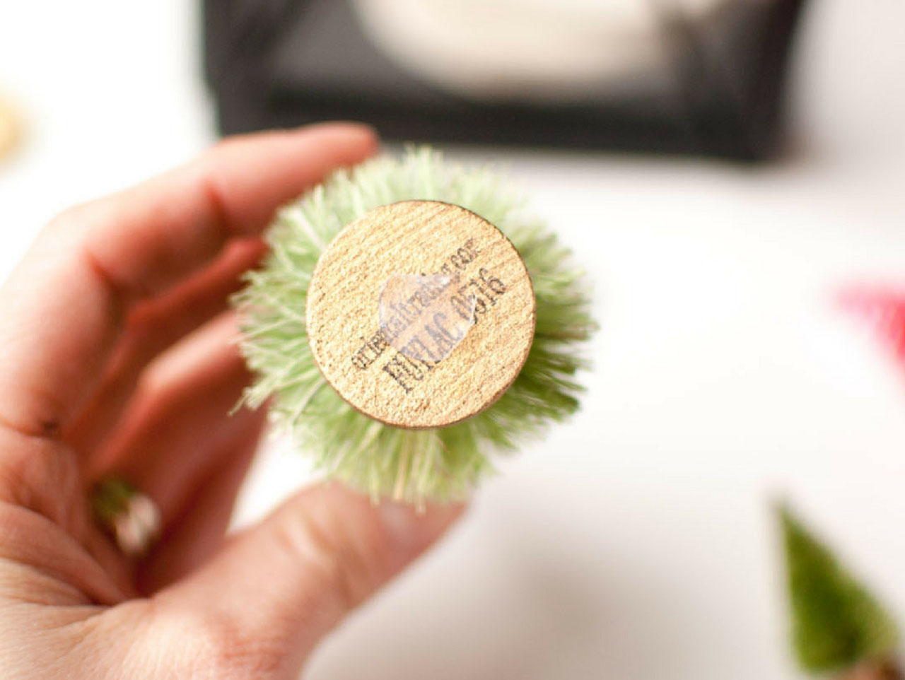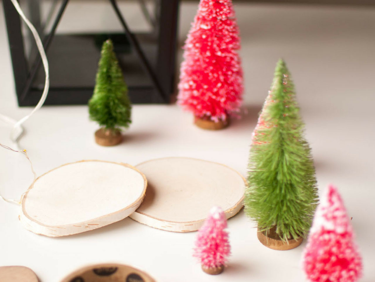 Insert several sizes and colors of trees. I used red and green trees. Attach these with a glue dot. You might be tempted to skip this step, but you won’t want to. When you start adding in the lights, if the trees are not secure they will fall over.