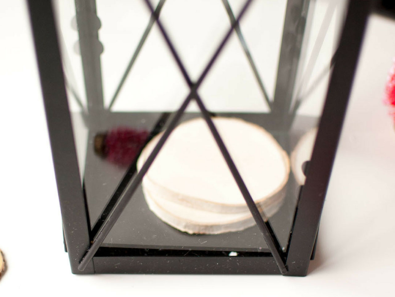 Place a few wood rounds in the bottom of your lantern. You can add several sizes of wood rounds. You can also stack them for additional height.
