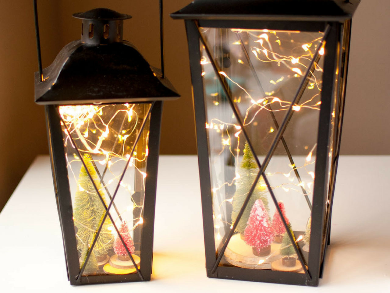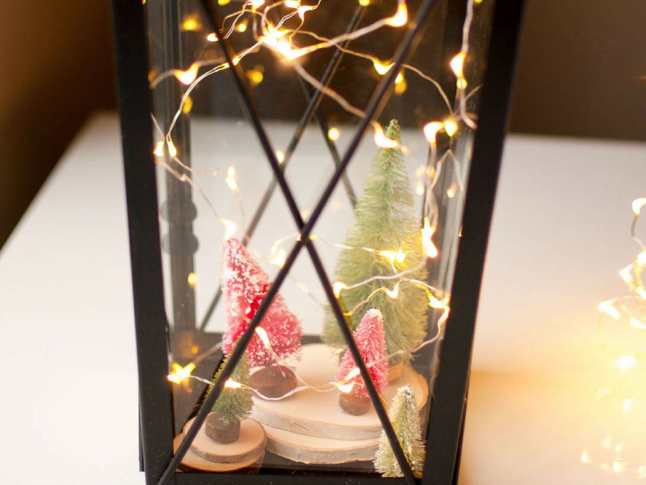 Add in the LED String Lights. Carefully arrange the lights inside the lantern without disturbing your trees. These lights can be easily manipulated and might require you to fuss with them until they are just right.