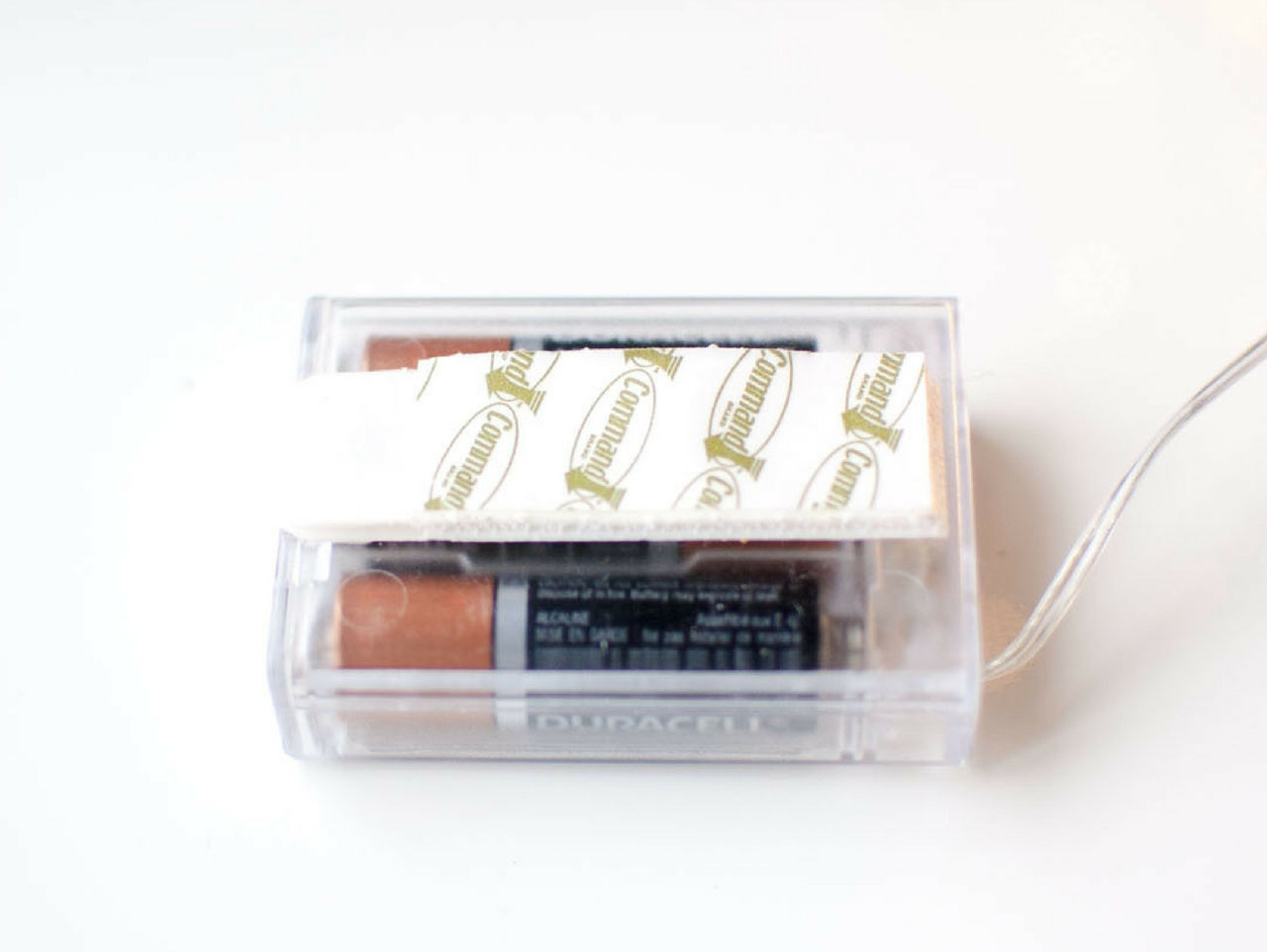 Attach a Command Strip® to the bottom of the battery pack. Apply your second command strip and peel off the back and stick to the inside of the lantern top. When the battery pack is secure, you can wind your excess lights around the battery pack.