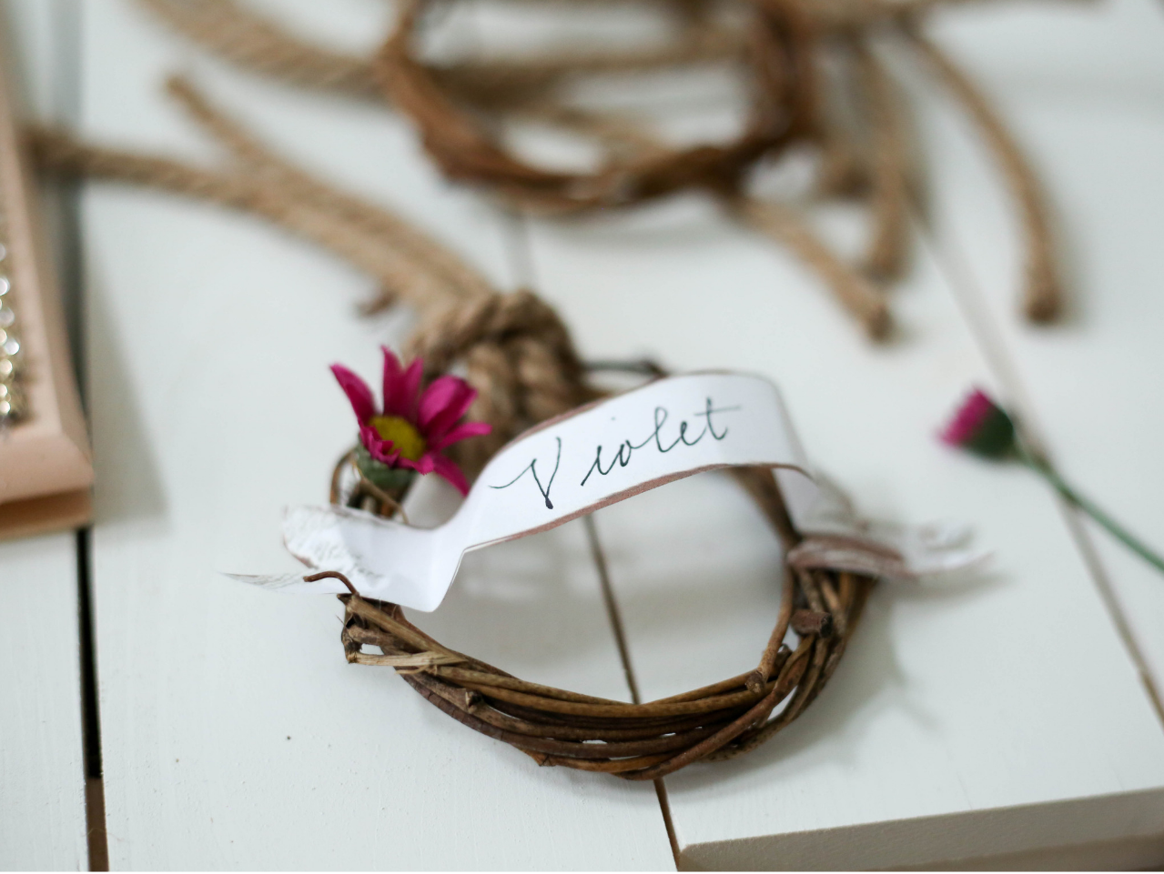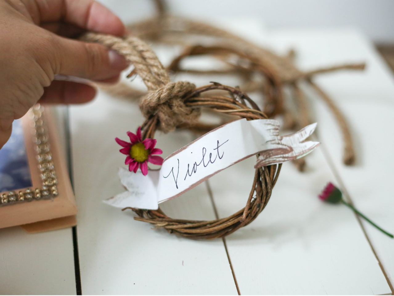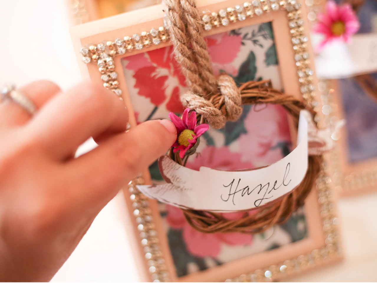 To secure the wreath, glue the cord to the back of the frame and you are finished! You have a unique and stylish touch of spring with wildflower fields inspired place cards. You guests will love this little take away handmade wedding favor as a memory of your special day.