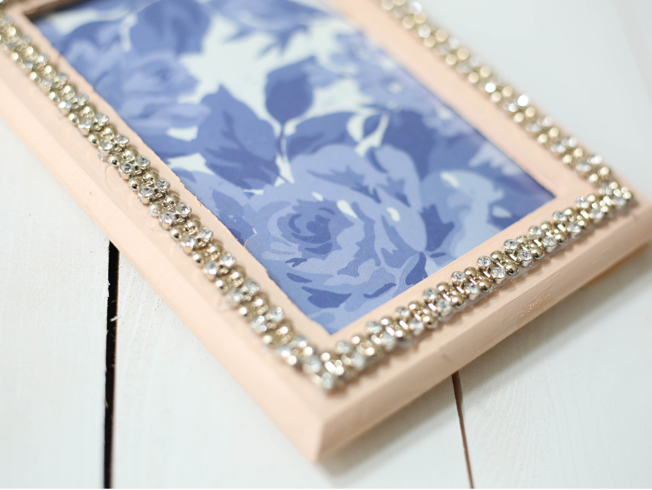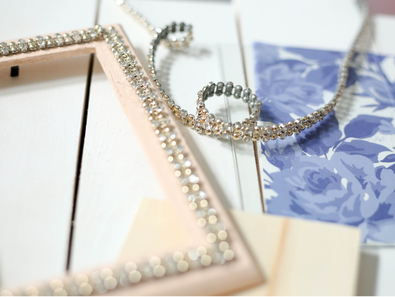 Cut a length of sparkling rhinestone trim. Proceed to glue the glittering jewels to the edges of the frame with hot glue to create a chic glamourous frame.