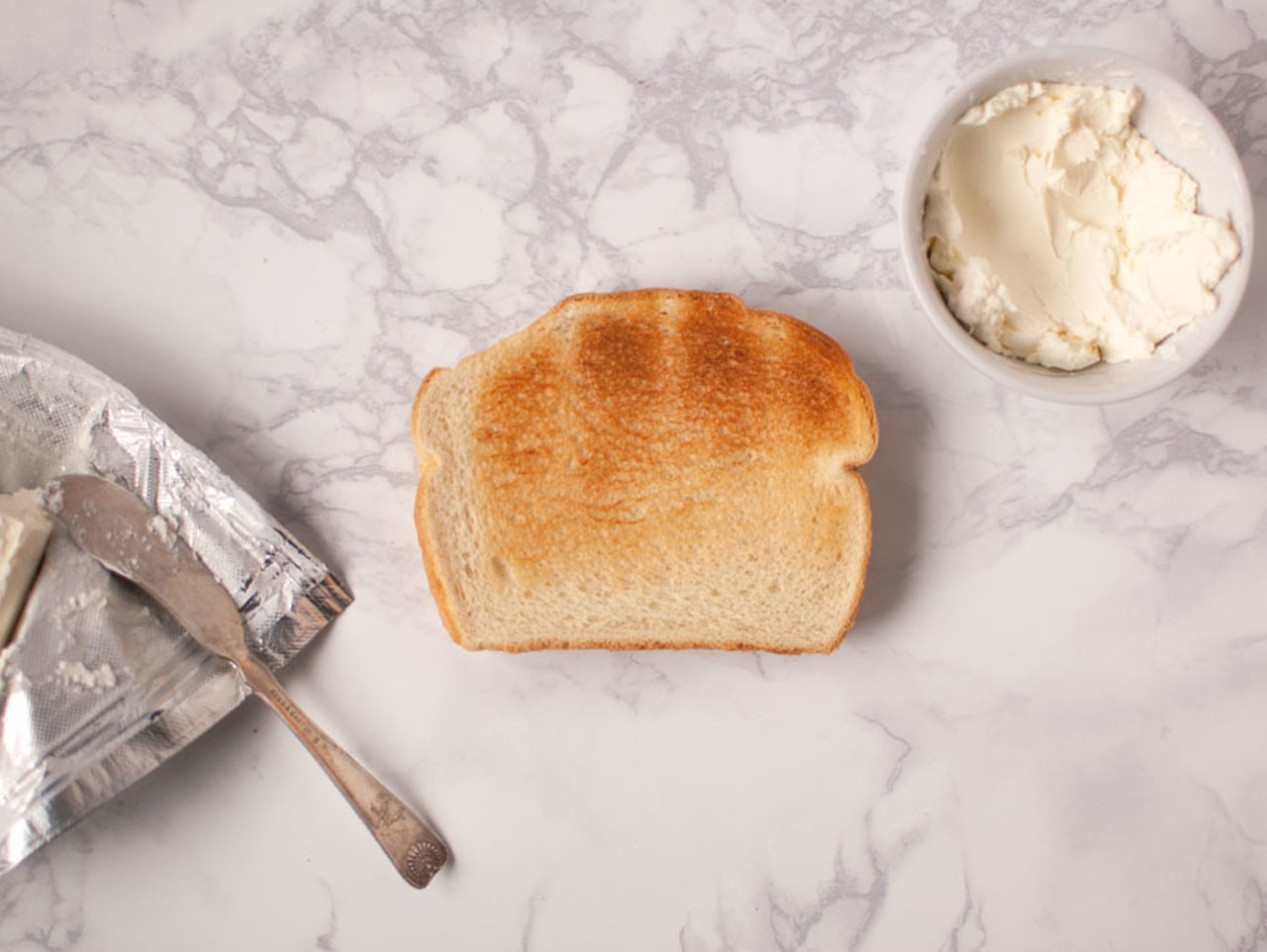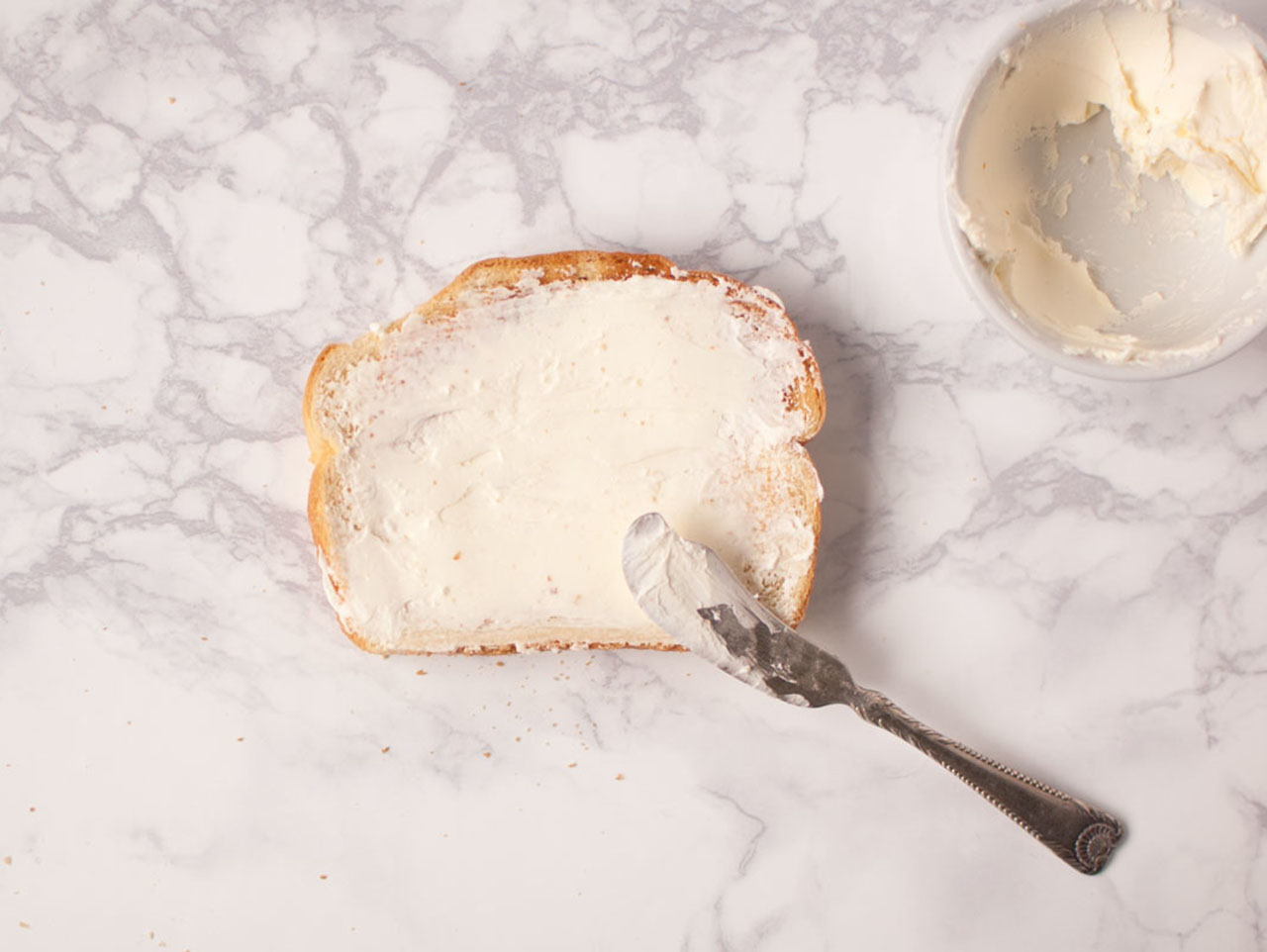 Spread cream cheese over entire piece of toast. Reserve two small ramekins full of cream cheese for berry cream cheese mixtures.