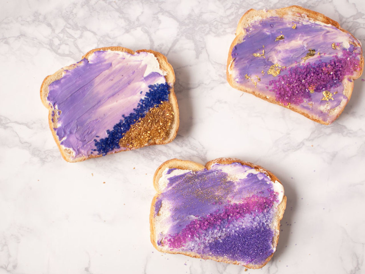 The berry syrup alone wasn’t giving me the deep purple color I was looking for so I ended up adding a drop of blue food coloring and a few drops of pink. Start by dolloping your dark purple cream cheese in a few spots on your toast. Dollop the light purple next. Spread the cream cheese creating beautiful streaks of purple.