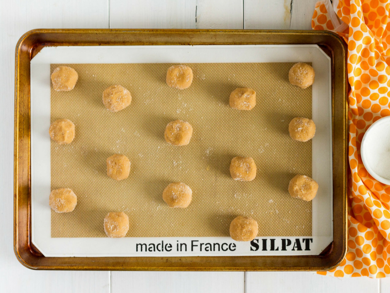 Scoop the dough into balls about the size of a big gumball. Roll each dough ball in granulated sugar, then place on a baking sheet lined with either parchment paper or a silicon baking mat.