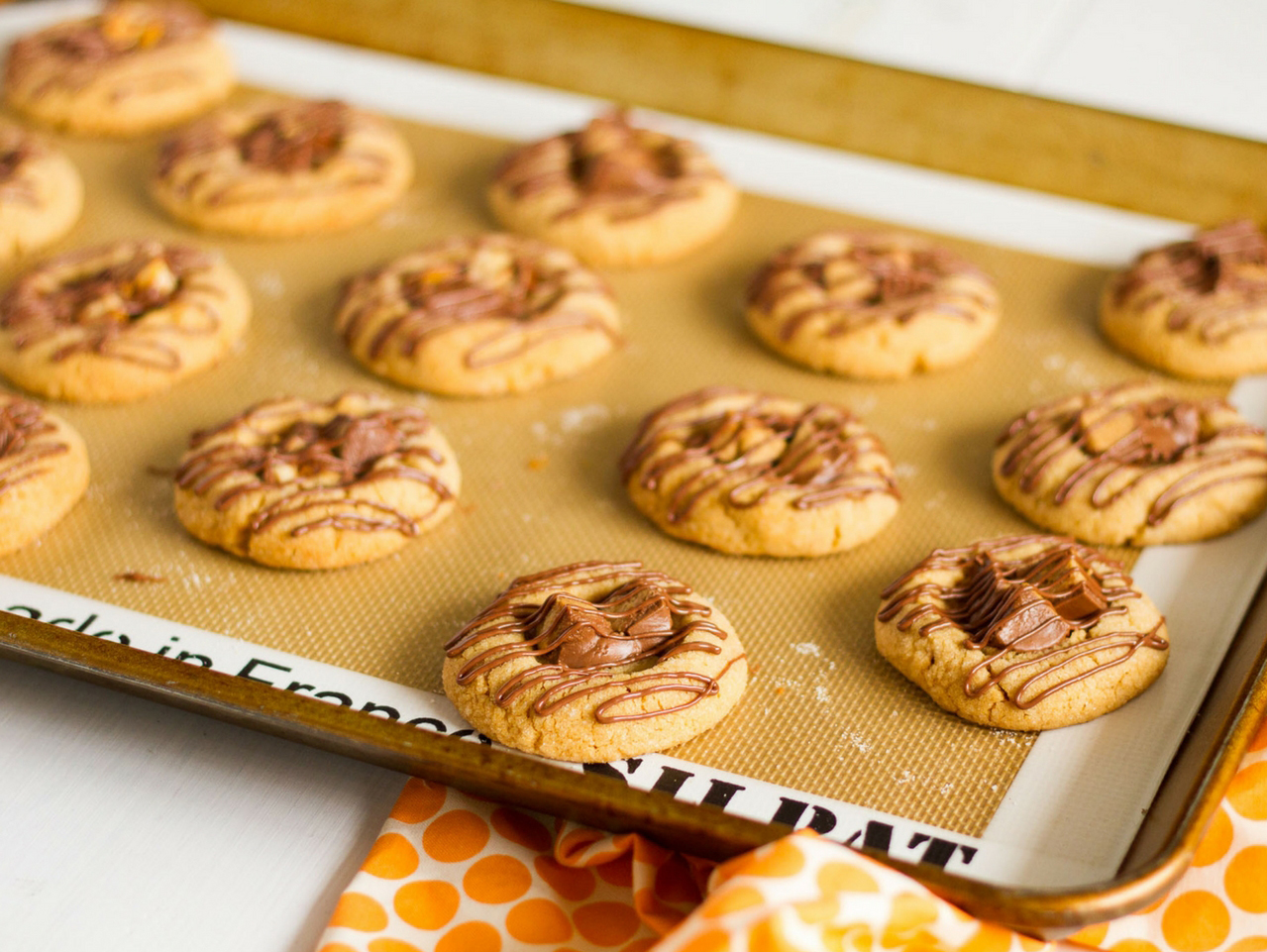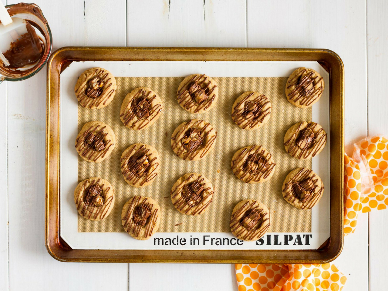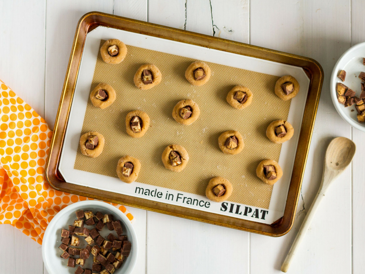 Use your thumb or the end of a wooden spoon to make a large well in the middle of each cookie dough ball. Stuff 3 candy bar chunks into each well. A quick tip: put the candy chunks cut side up; they'll look prettier when they melt than if you put them chocolate side up. Bake the cookies for 10-15 minutes, until the cookies are set and just beginning to turn golden on the edges. Remove from the oven and allow to cool.