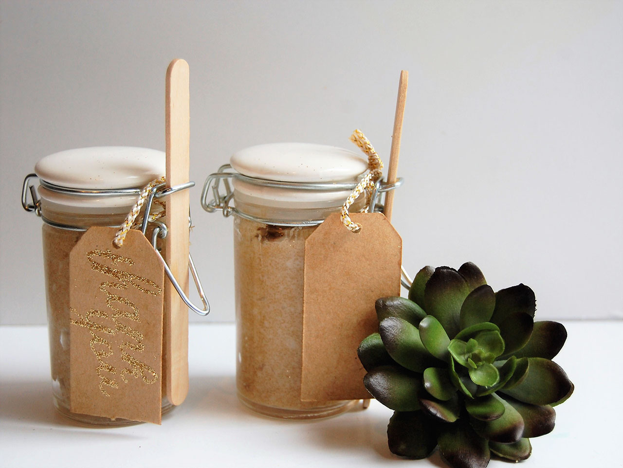 Scoop into small favor jars or tins. Make sure your container is air tight to ensure your scrub stays fresh. Store in the refrigerator or a cool dry place. Add a cute “Thank You” tag and attach a Wooden Craft Stick to use as a scoop.