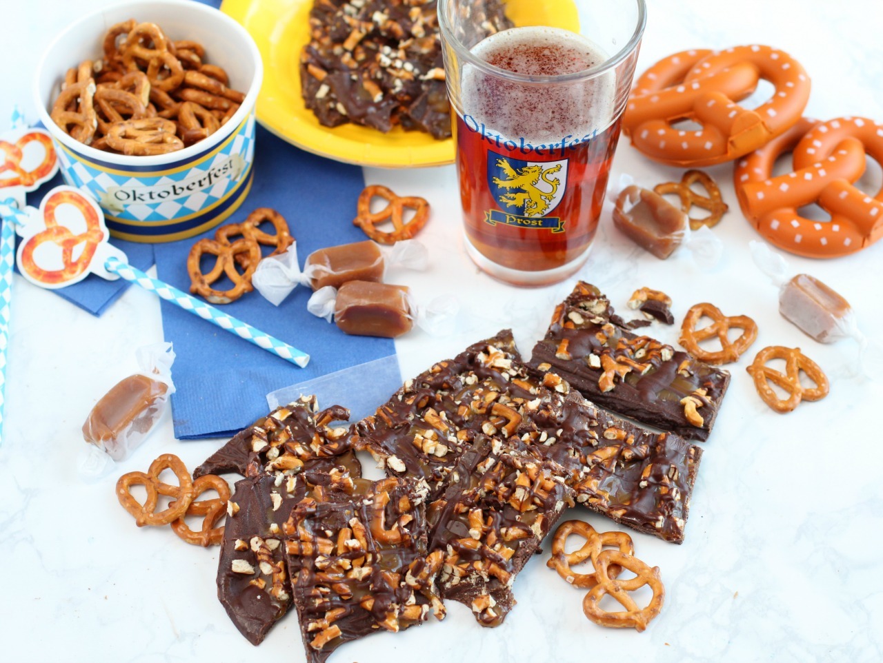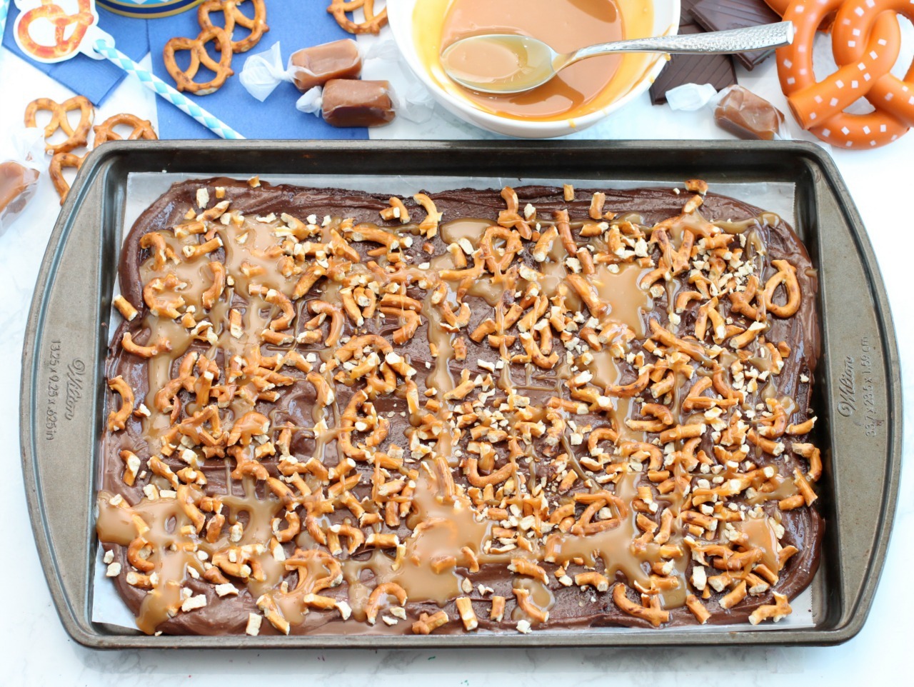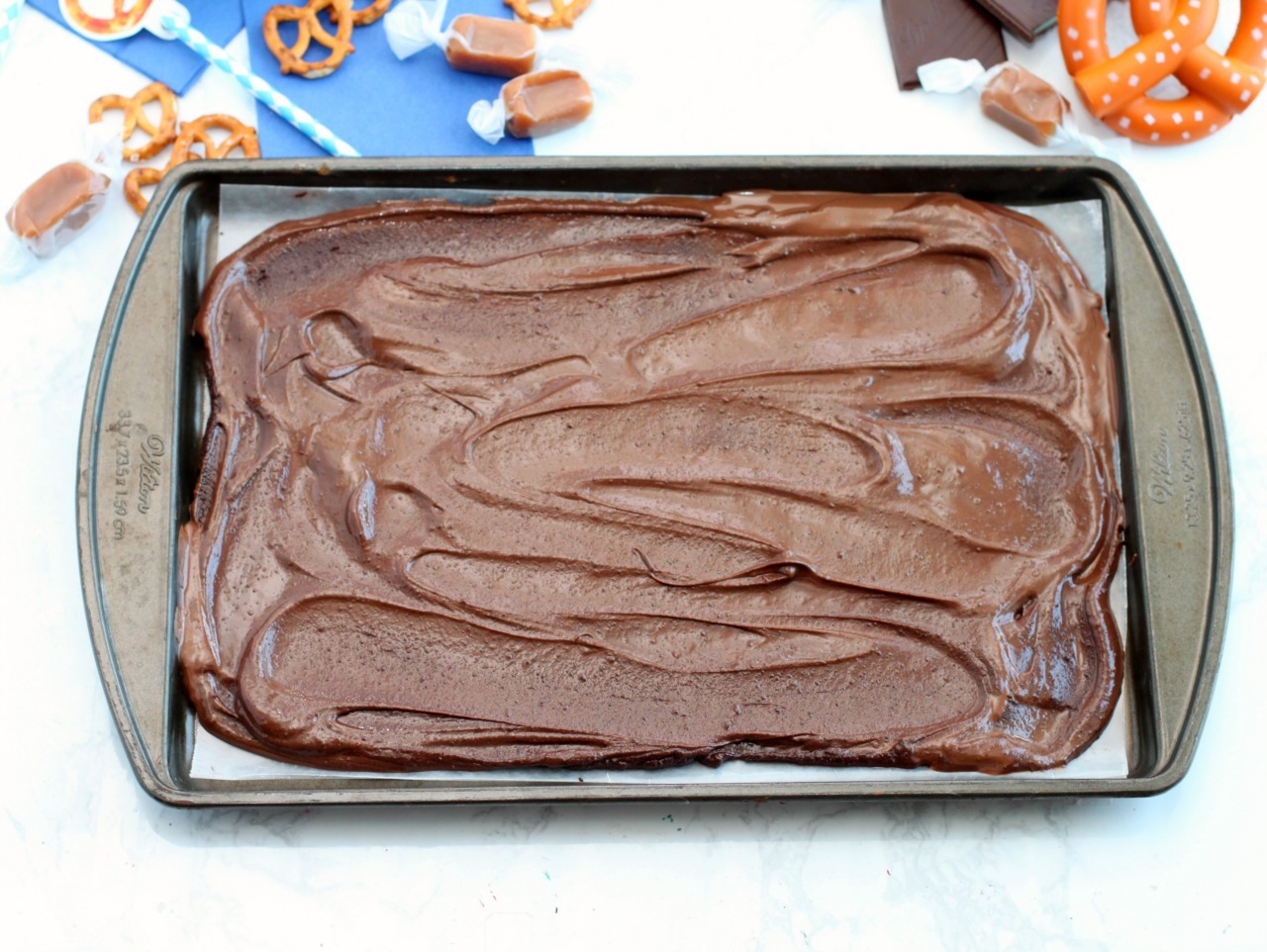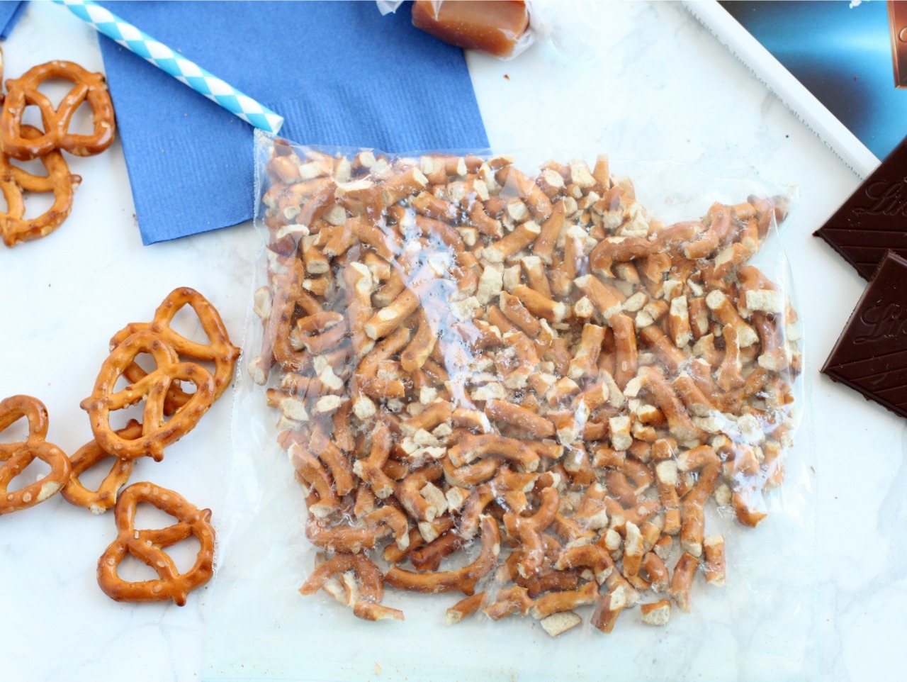 Place the pretzels in a ziplock bag and use a rolling pin to break them into smaller pieces. Sprinkle the pretzels down over the chocolate and gently press them into the chocolate.