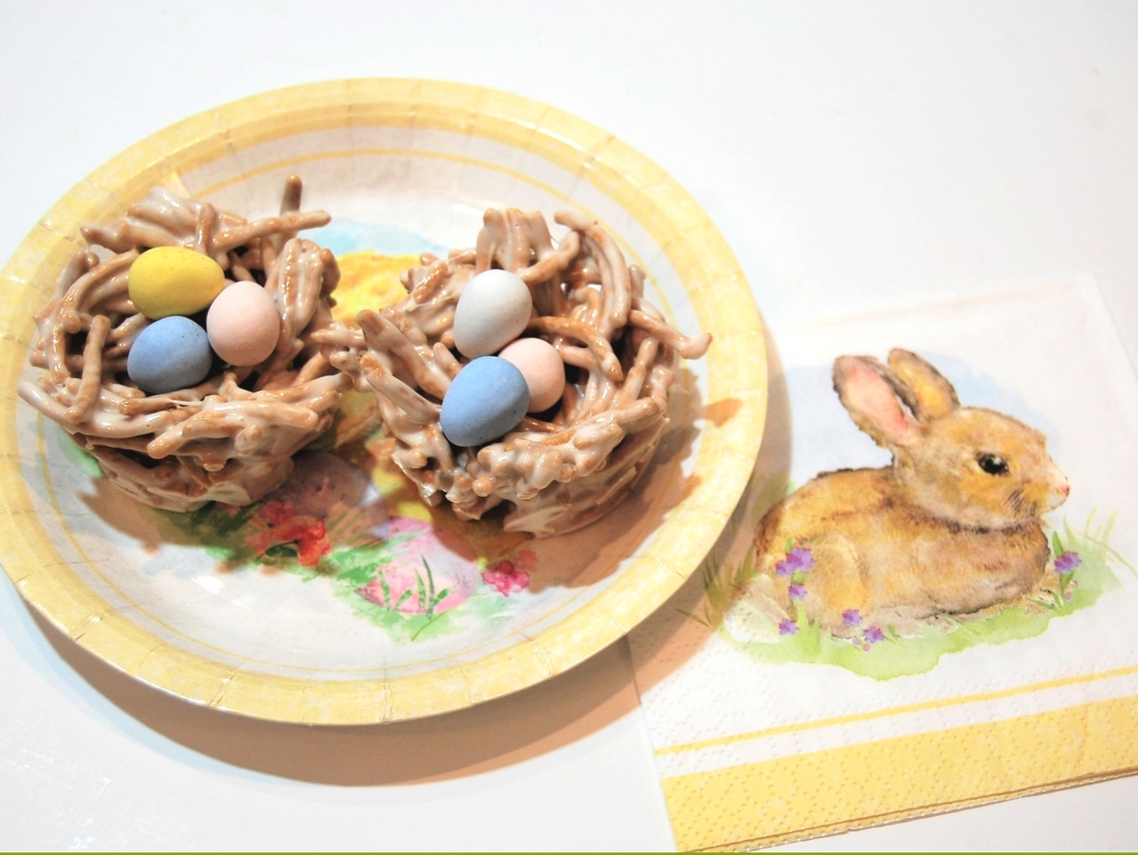 Remove nests from muffin tin, and add chocolate covered eggs to each. You could also use jelly beans or even a chick Peep. Place these on a cute tray for display, or use and place cards on your Easter table!