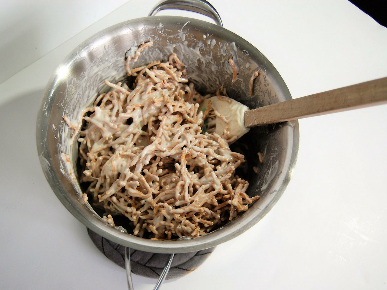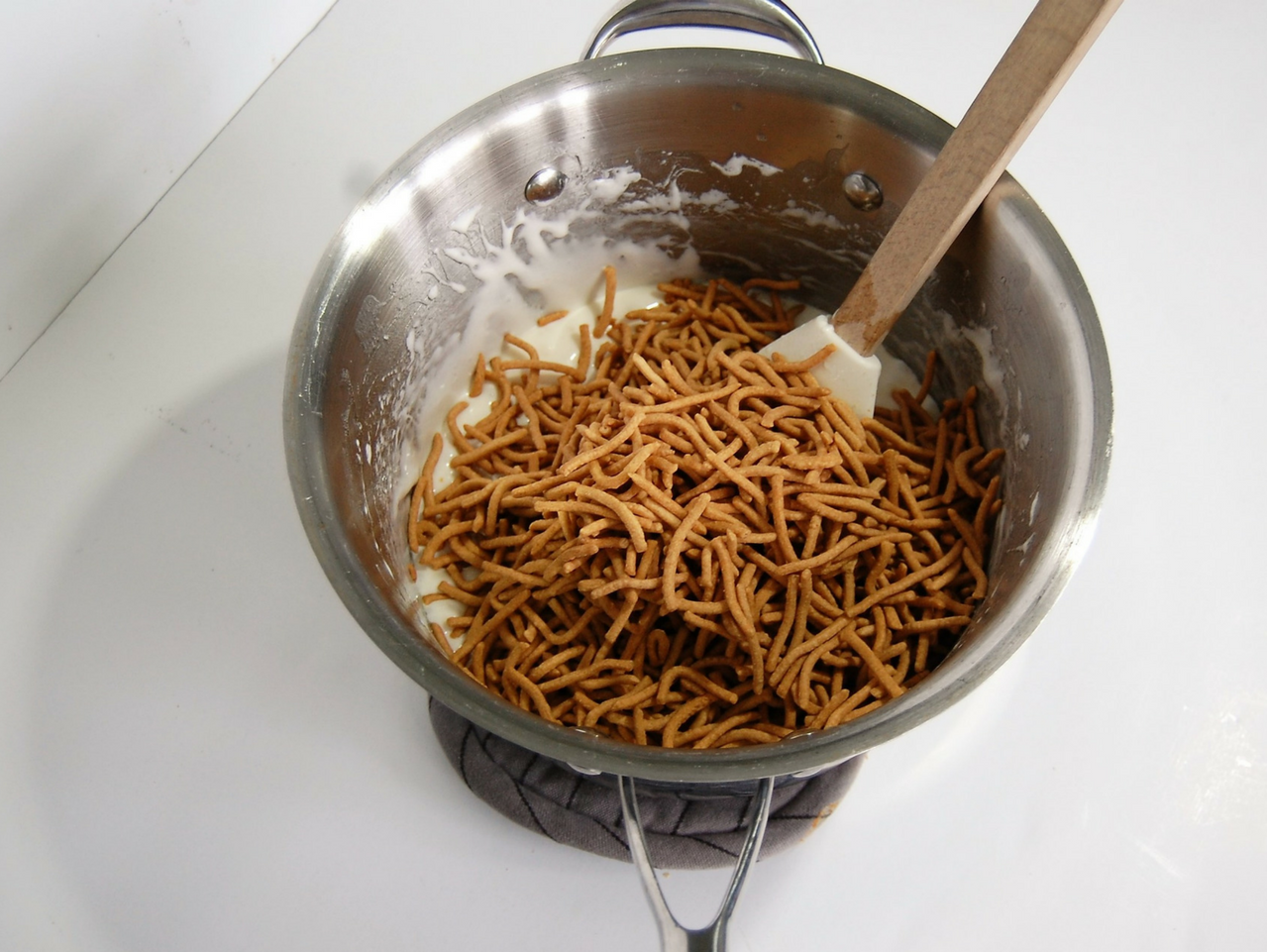 Remove from heat. Add a bag of Chow Mein Noodles to the melted marshmallow mixture.