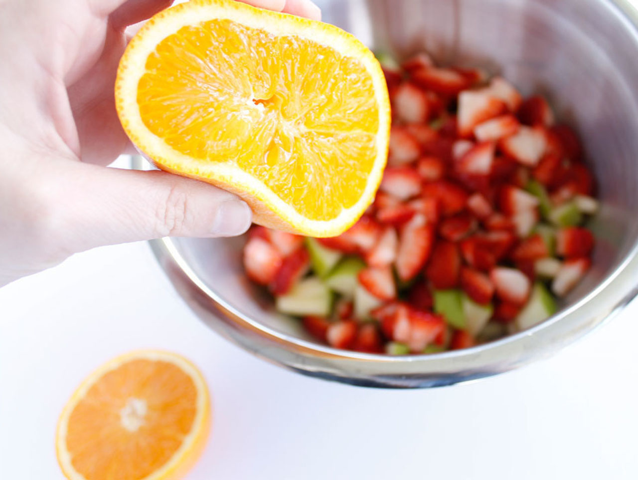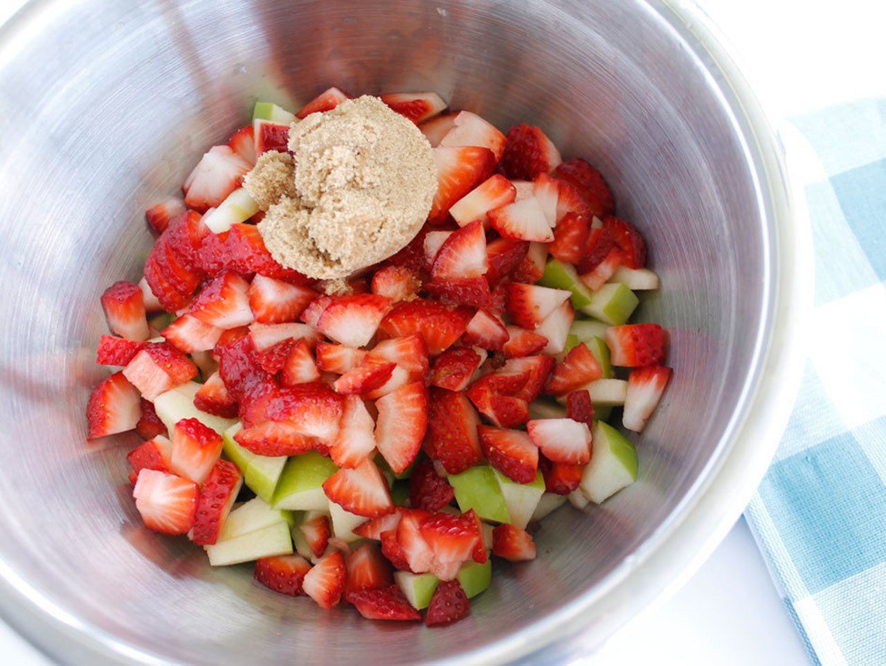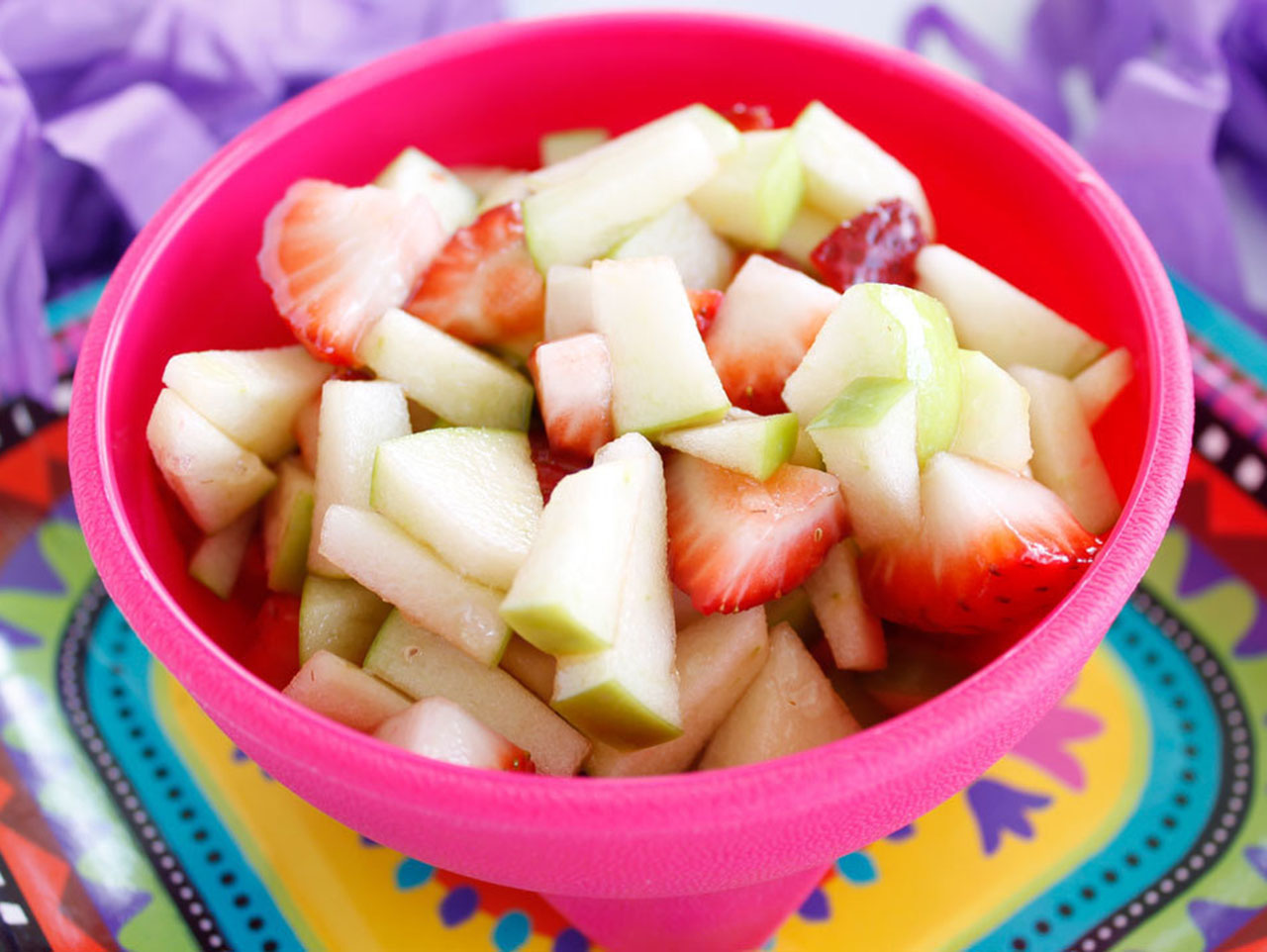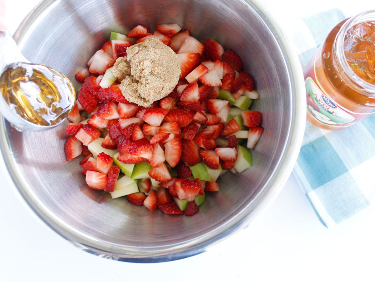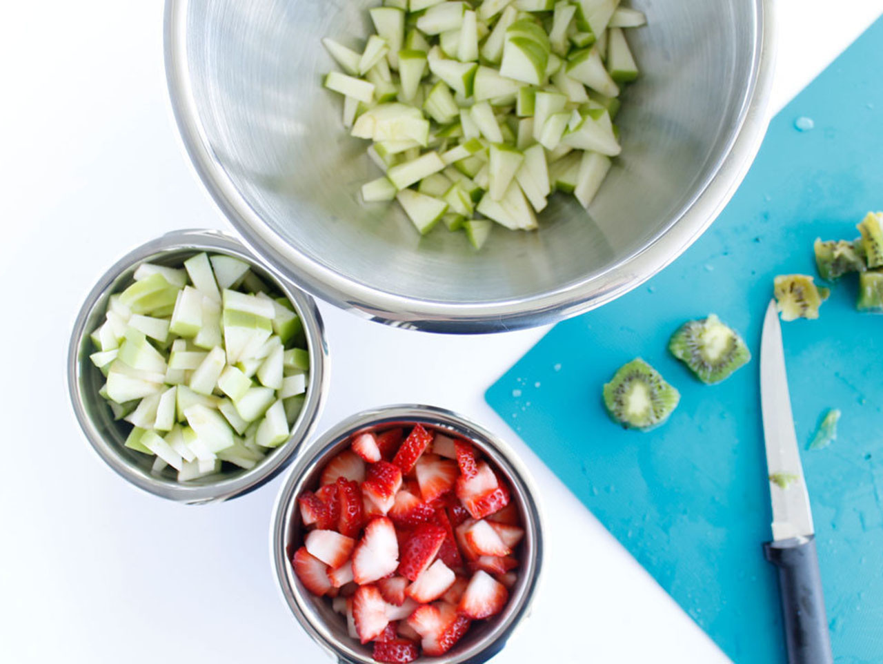Cut apples, strawberries, and kiwi into small pieces and into a large bowl.
