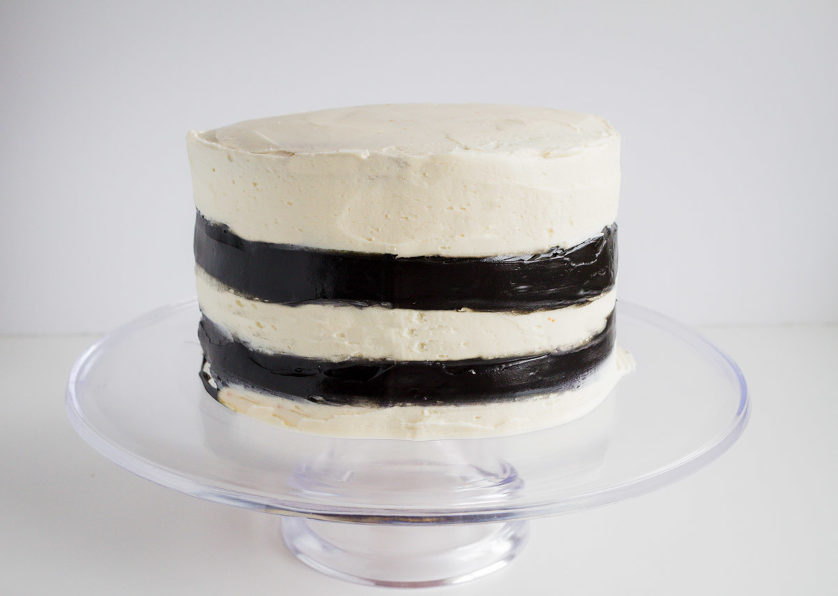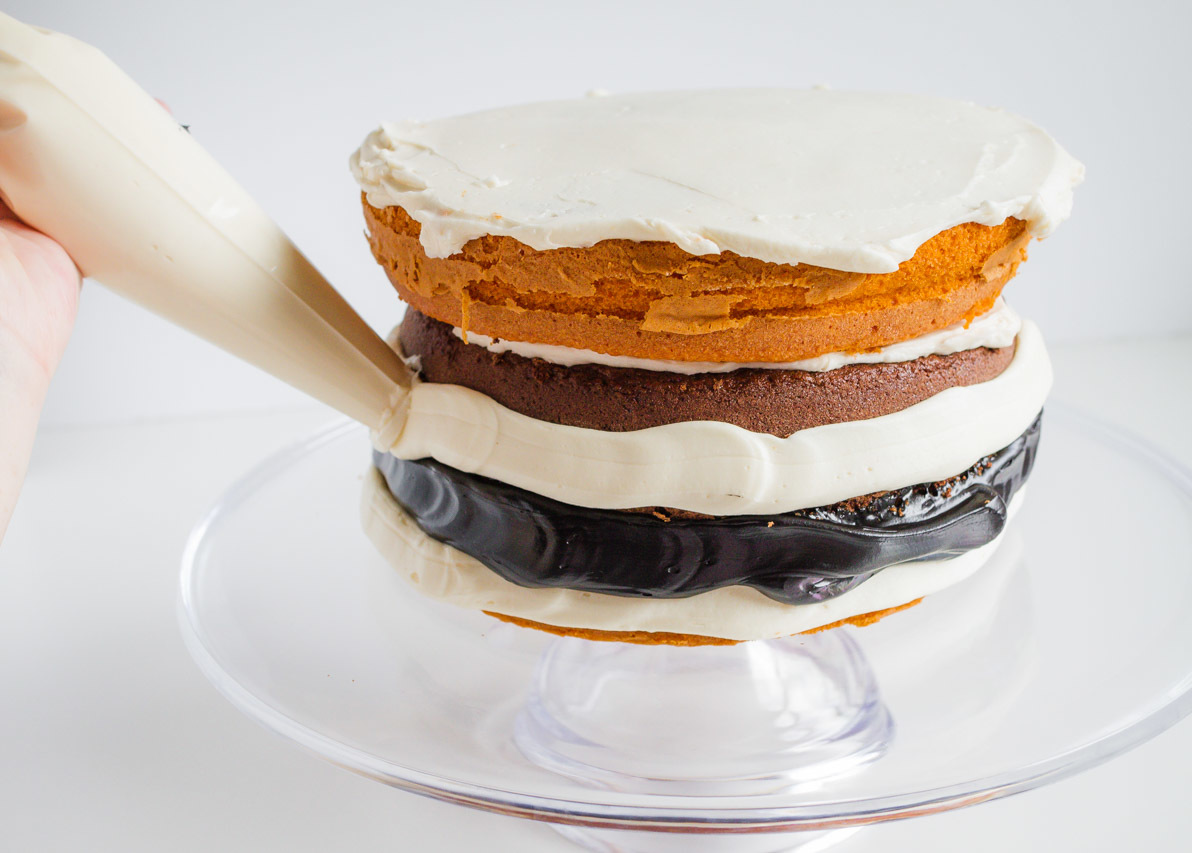 Layer a vanilla, chocolate, then vanilla cake on to a Footed Cake Stand with a thin layer of vanilla frosting in the middle of each layer. Spread a thin layer of vanilla frosting on the top layer. Then alternating between chocolate and vanilla frosting, pipe a band around the entire cake starting at the bottom.