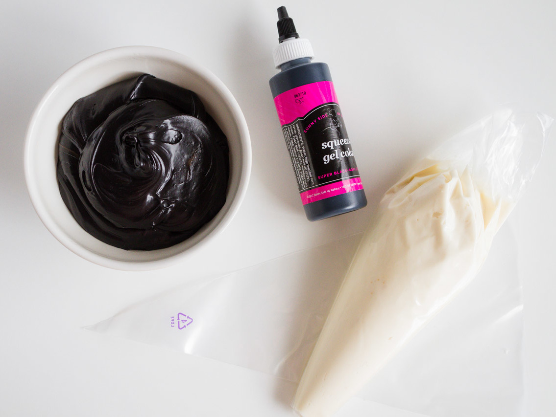Scoop chocolate frosting into a medium bowl and stir in 5-6 drops of black gel food coloring. Spoon into an icing/piping bag and the vanilla frosting into another bag. Snip off the end to make a large opening.