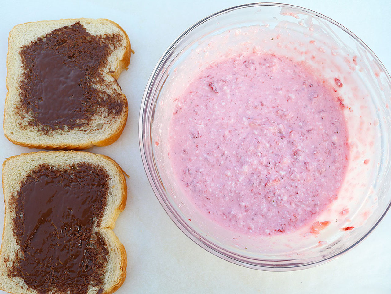 Add the cream cheese to puree and stir. Spread the cocoa hazelnut spread on one side of each slice of bread.