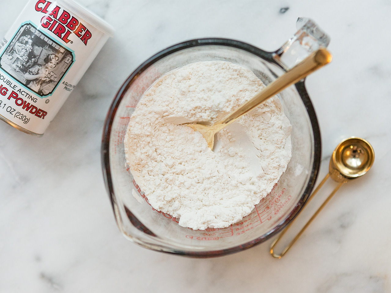 In a smaller bowl, stir the flour and baking powder just until combined. Add the dry mixture to the liquid and beat until everything is combined.