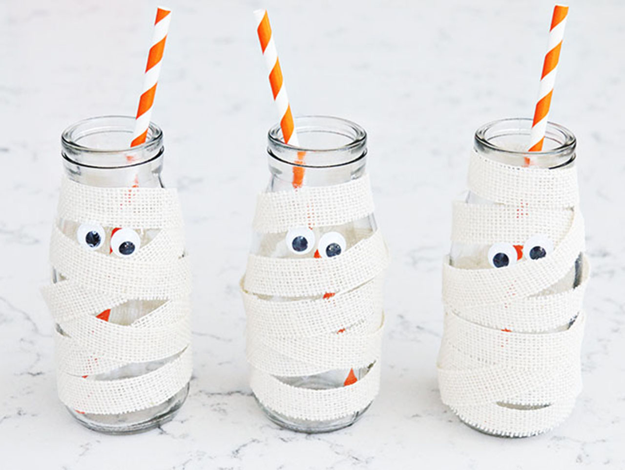 To make the mummy milk jars, tightly wrap burlap ribbon around the jars. I use double side tape to adhere the ribbon. For a more permanent fix, use hot glue. Add googly eyes on the top of the jar. Pour some cold milk and add an orange striped straw!