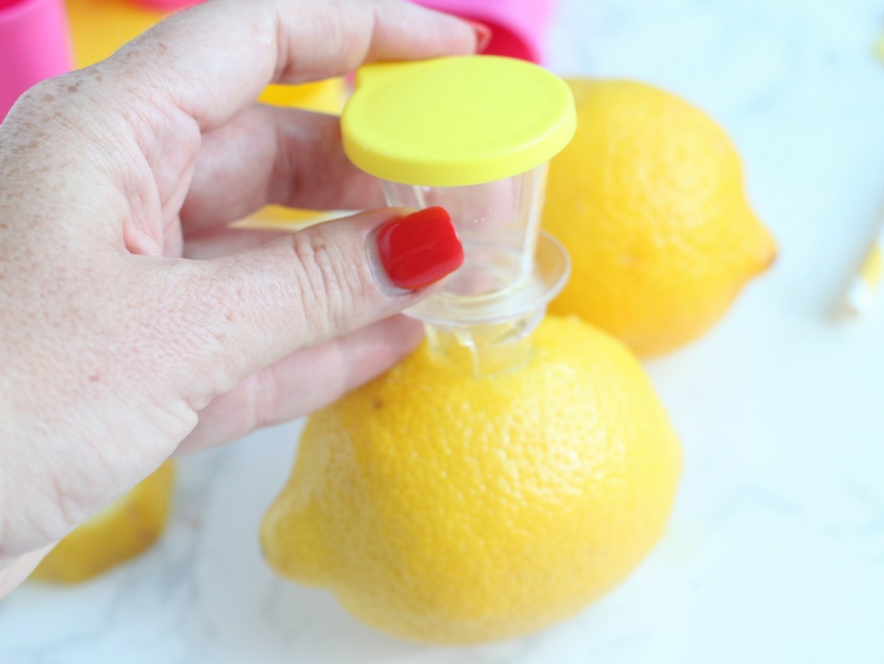 Add the fresh squeezed lemon juice to the bowl. When we were in Italy we bought one of these crazy juicing contraptions after we were memorized by the vendor at the local market and all the juice he could get from one lemon. It was fun to use this little contraption because it reminded me of our trip, but you can use your favorite method to get your fresh squeezed lemon juice.