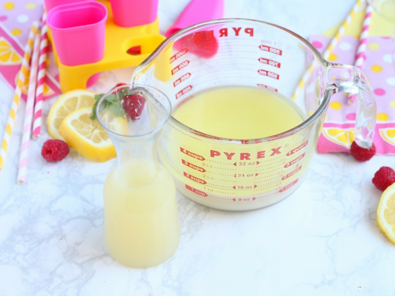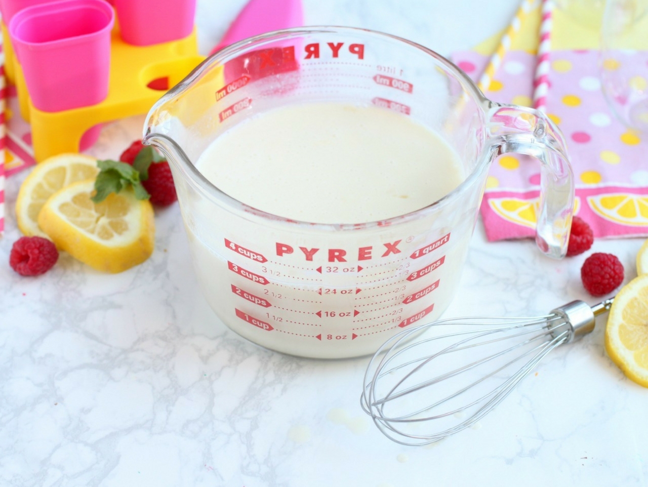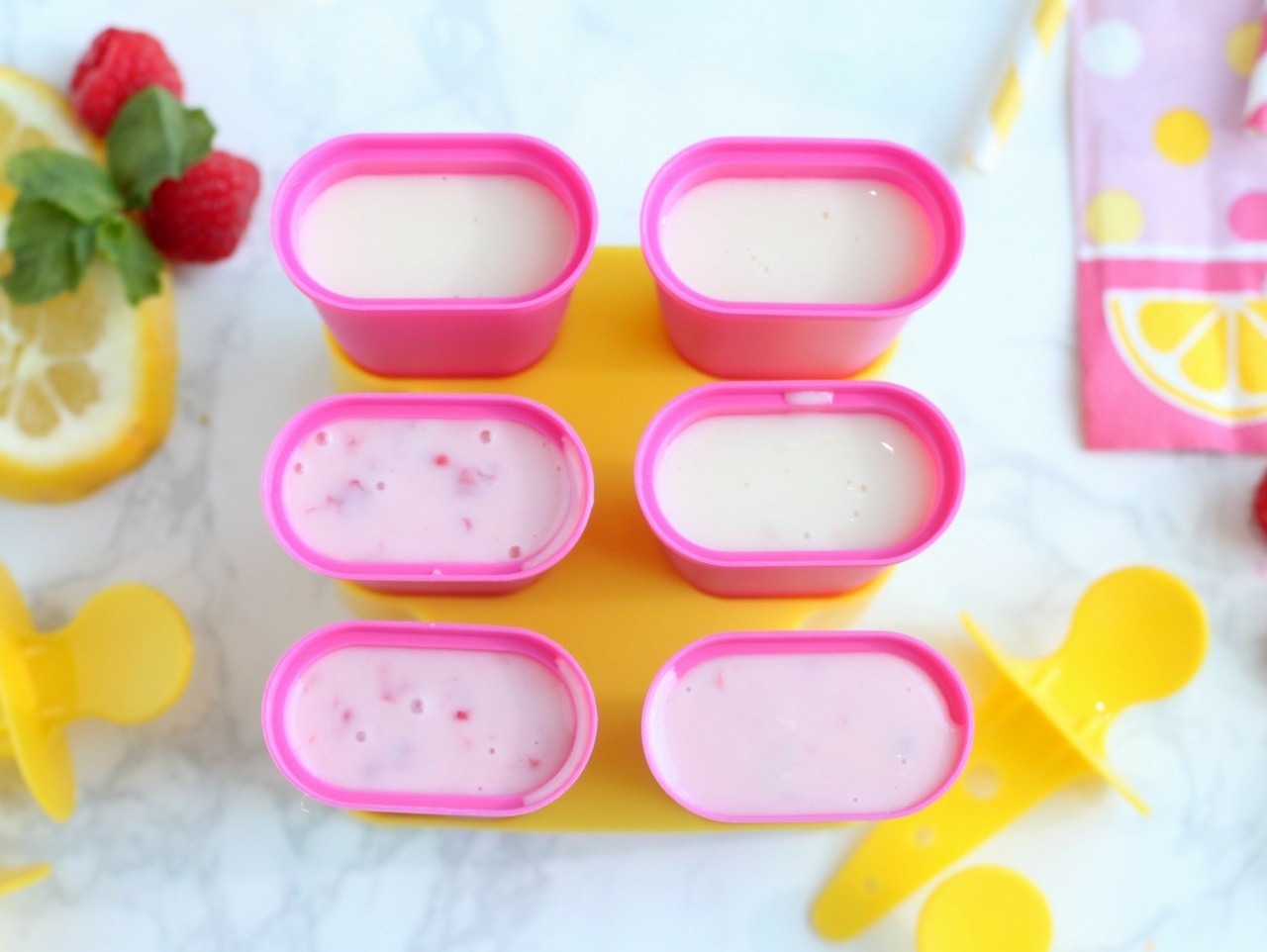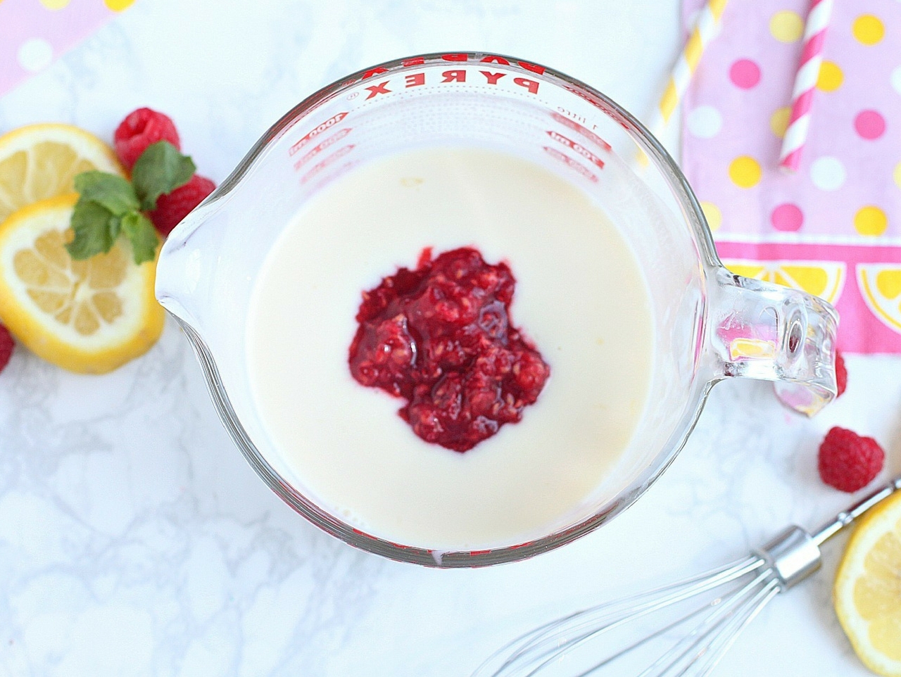 If you want just lemon flavored poptails you can stop here. But, if you want to make these beauties extraordinary add 1/2 cup of finely chopped raspberries and mix everything together.
