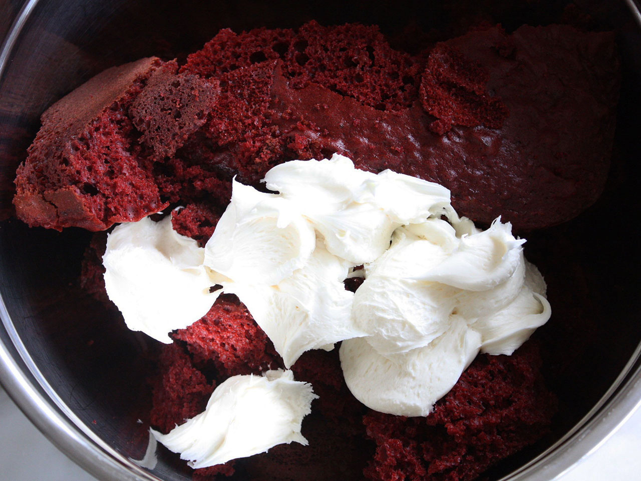 In a large bowl, combine cake and ¾ jar frosting. Mix frosting into cake until a dough like consistency forms.